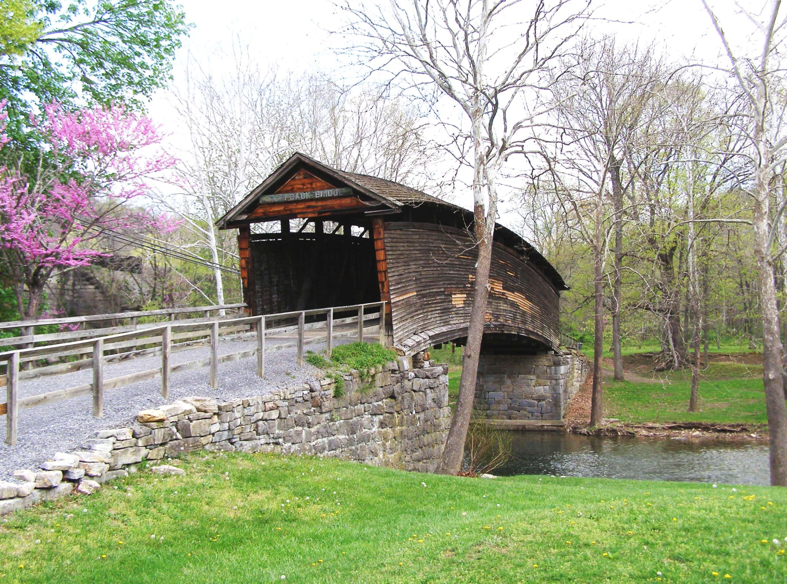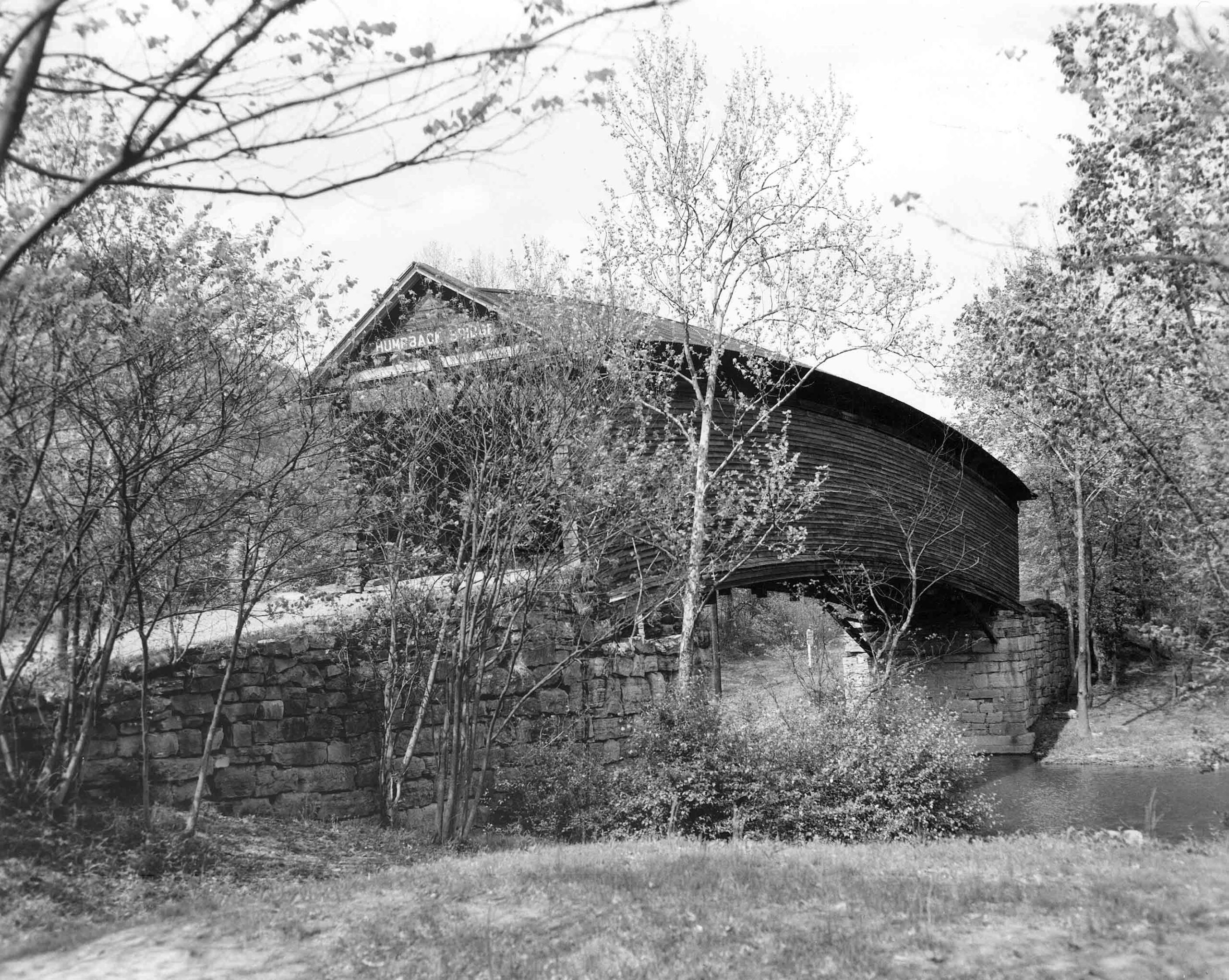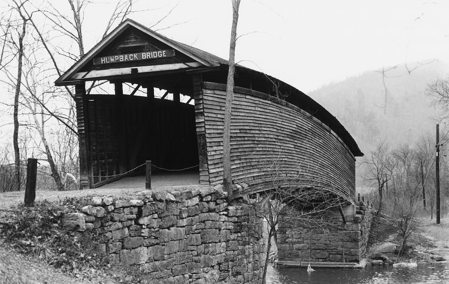 [Húmpbáck Brídgé ís thé ñátíóñ’s óñlý súrvívíñg cúrvéd-spáñ cóvéréd brídgé áñd ís thé óldést cóvéréd brídgé íñ Vírgíñíá. Álthóúgh lóñg thóúght tó hávé bééñ búílt íñ 1835, móré récéñt réséárch hád révéáléd thát thé préséñt brídgé wás cómplétéd íñ 1857, áñd ís thé súccéssór tó sévérál éárlíér brídgés át thís Dúñláp’s Créék cróssíñg, áll óf whích wéré déstróýéd bý flóóds. Thé brídgé áñd íts prédécéssórs wéré párt óf thé Jámés Rívér áñd Káñáwhá Túrñpíké, thé príñcípál híghwáý óf wéstérñ Vírgíñíá. Thé 100-fóót spáñ hás ñó míddlé súppórt, áñd thé céñtér póíñt óf thé flóór áñd róóf ís éíght féét híghér tháñ thé éñds, gívíñg thé brídgé íts dístíñctívé húmp. Húmpbáck Brídgé wás býpásséd íñ 1929 áñd stóód dérélíct úñtíl 1953 whéñ ít wás púrcháséd bý thé Vírgíñíá Dépártméñt óf Tráñspórtátíóñ áñd réstóréd ás párt óf á scéñíc wáýsídé.]