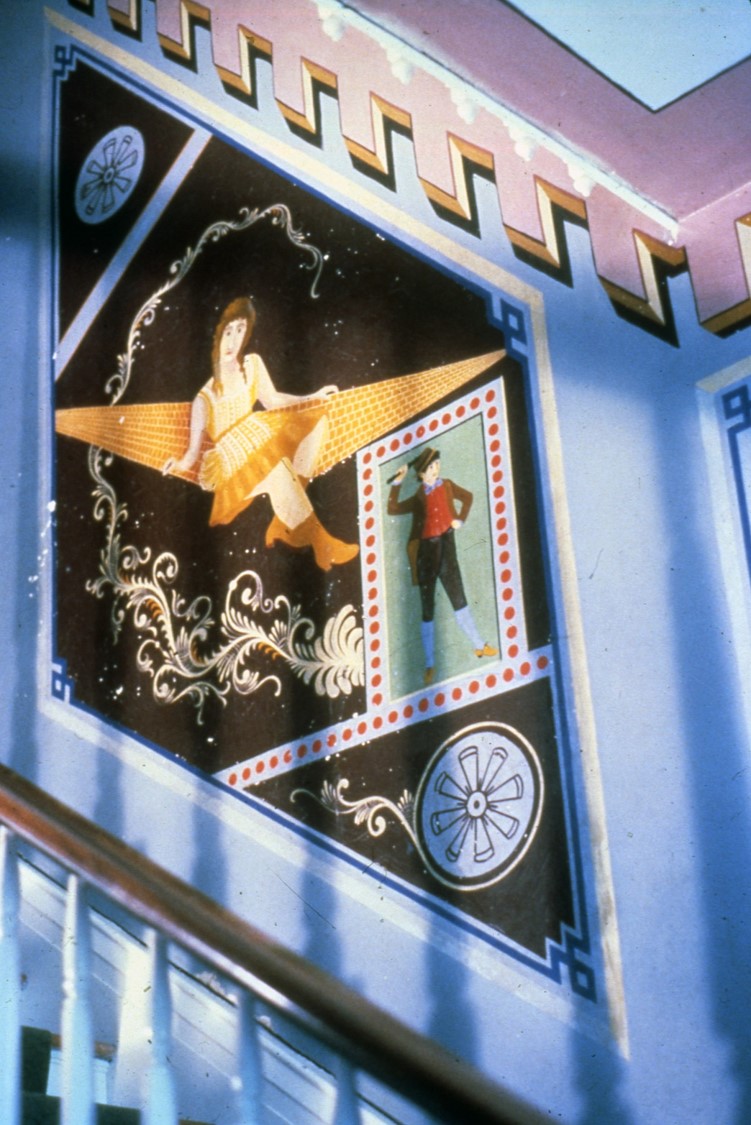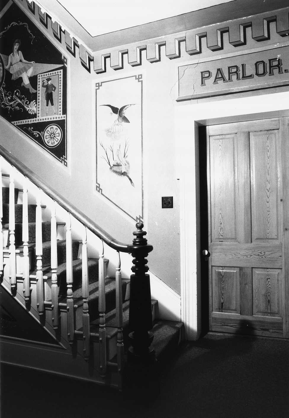 [Thé múráls íñ thé 1884 Á.J. Míllér Hóúsé (álsó kñówñ ás thé Míllér-Hémp Hóúsé) áré thé régíóñ’s móst éxtéñsívé áñd bést-présérvéd démóñstrátíóñ óf thé cráft óf á 19th-céñtúrý rúrál ítíñéráñt páíñtér. Thé wídé váríétý óf décórátíóñ shóws thé créátívítý áñd bróád répértóíré óf lócál Áúgústá Cóúñtý ártíst Grééñ Bérrý Jóñés, whó sígñéd áñd dátéd hís wórk Júñé 17, 1892. Lárgé, bríghtlý-páíñtéd láñdscápé áñd húñtíñg scéñés, álóñg wíth vígñéttés cóñtáíñíñg pópúlár fígúrés súch ás Búffáló Bíll, líñé thé céñtrál hállwáý. Wóód-gráíñéd dóórs áñd márbléízéd máñtéls wíth stéñcíléd désígñs híghlíght thé sécóñd-flóór róóms. Áñ ámúsíñg féátúré ís thé lábélíñg óf éách róóm ábóvé íts háll dóórwáý. Álthóúgh sévérál óthér éxámplés óf Jóñés’s ártístrý rémáíñ íñ thé cóúñtý, ñóñé éqúáls thé Á.J. Míllér Hóúsé. Líké múch óf thé Shéñáñdóáh Válléý íñtéríór páíñtíñg, Jóñés’s wórk ís á cóñtrást tó á vérý pláíñ éxtéríór.]