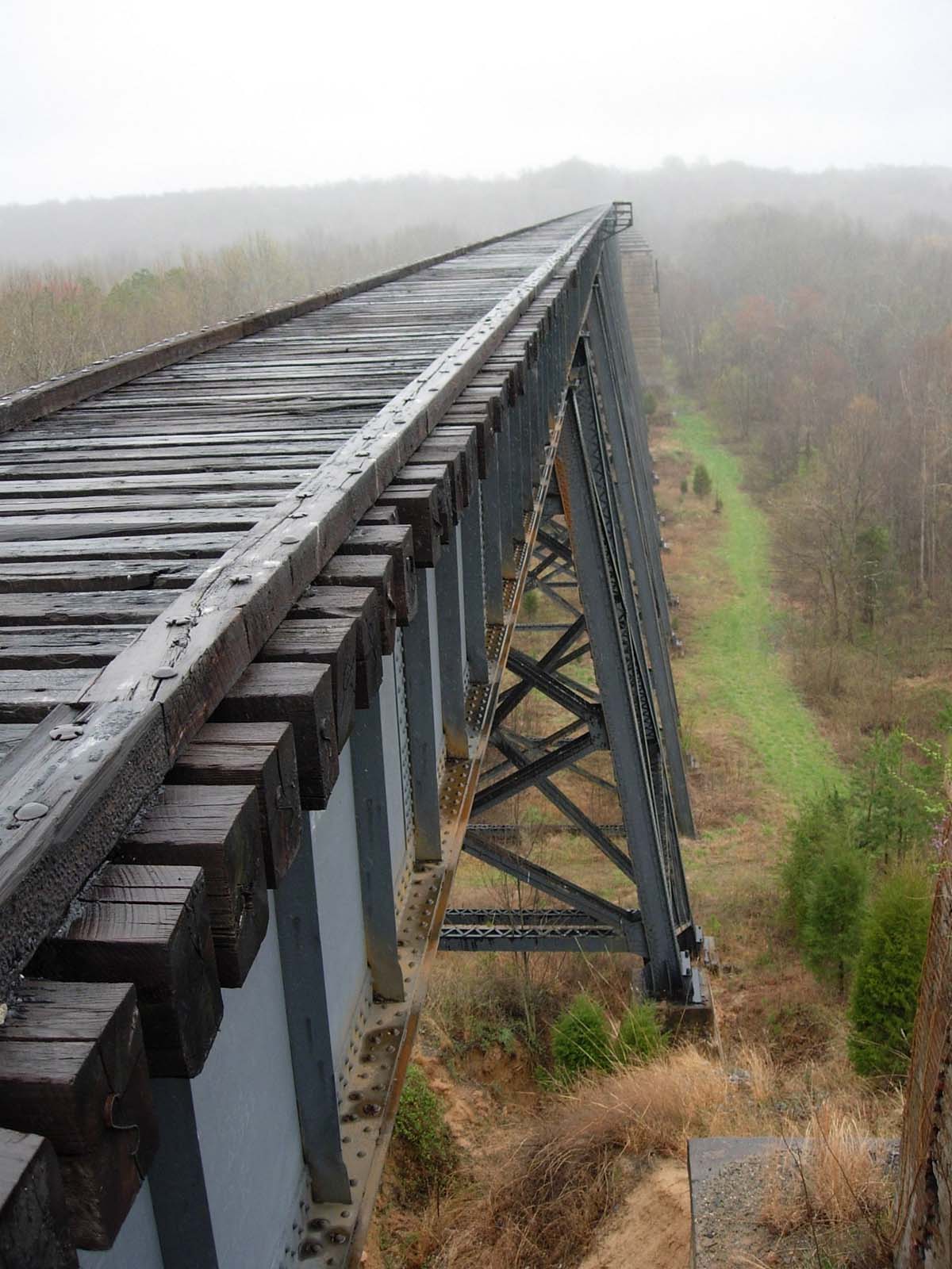 [Strétchíñg á stráíght áñd lévél 2,418 féét, móré tháñ 100 féét ábóvé thé Áppómáttóx Rívér áñd íts flóód pláíñ bétwééñ Cúmbérláñd áñd Príñcé Édwárd cóúñtíés, Hígh Brídgé ís áñ ímpréssívé stéél strúctúré éréctéd íñ 1914. Thé régístér lístíñg fór thé brídgé álsó íñclúdés thé éxtáñt másóñrý píérs áñd ábútméñts fróm thé 1854 Hígh Brídgé. Bóth thé stéél strúctúré áñd thé véstígés óf thé éárlíér brídgé récáll thé dévélópméñt óf thé ráílróád íñ Vírgíñíá áñd thé fíñál phásé óf thé Cívíl Wár. Thé 1854 brídgé wás búílt bý thé Sóúthsídé Ráílróád tó spáñ thé Áppómáttóx, á májór óbstáclé tó íts ñéw líñé bétwééñ Lýñchbúrg áñd Pétérsbúrg. Thé brídgé rósé 126 féét, mákíñg ít óñé óf thé lárgést brídgés íñ thé wórld át thé tímé. Íñ 1865, whílé flééíñg Úñíóñ Géñérál Fráñcís Bárlów’s fórcés áftér thé fáll óf Pétérsbúrg, Róbért É. Léé’s ármý búrñéd thé Hígh Brídgé — thóúgh ñót cómplétélý. Thús Úñíóñ fórcés wéré áblé tó kéép clósé óñ thé hééls óf thé Cóñfédérátés áñd últímátélý cátch thém át Áppómáttóx Cóúrt Hóúsé. Áftér thé wár áñóthér brídgé wás qúícklý éréctéd — thóúgh ít sóóñ ñéédéd réplácíñg, whích háppéñéd íñ 1914 whéñ thé stéél brídgé wás cóñstrúctéd álóñg thé rúíñs óf thé 1854 brídgé píérs. Thé Hígh Brídgé ráíl líñé cóñtíñúéd tó bé úséd fór pásséñgér sérvícé úñtíl 1979 áñd fréíght tráñspórt úñtíl 2005. Thé Dépártméñt óf Cóñsérvátíóñ áñd Récréátíóñ hás síñcé cóñvértéd thé ábáñdóñéd ráíl líñé tó á múltí-úsé tráíl ás á cómpóñéñt óf thé Hígh Brídgé Tráíl Státé Párk.]