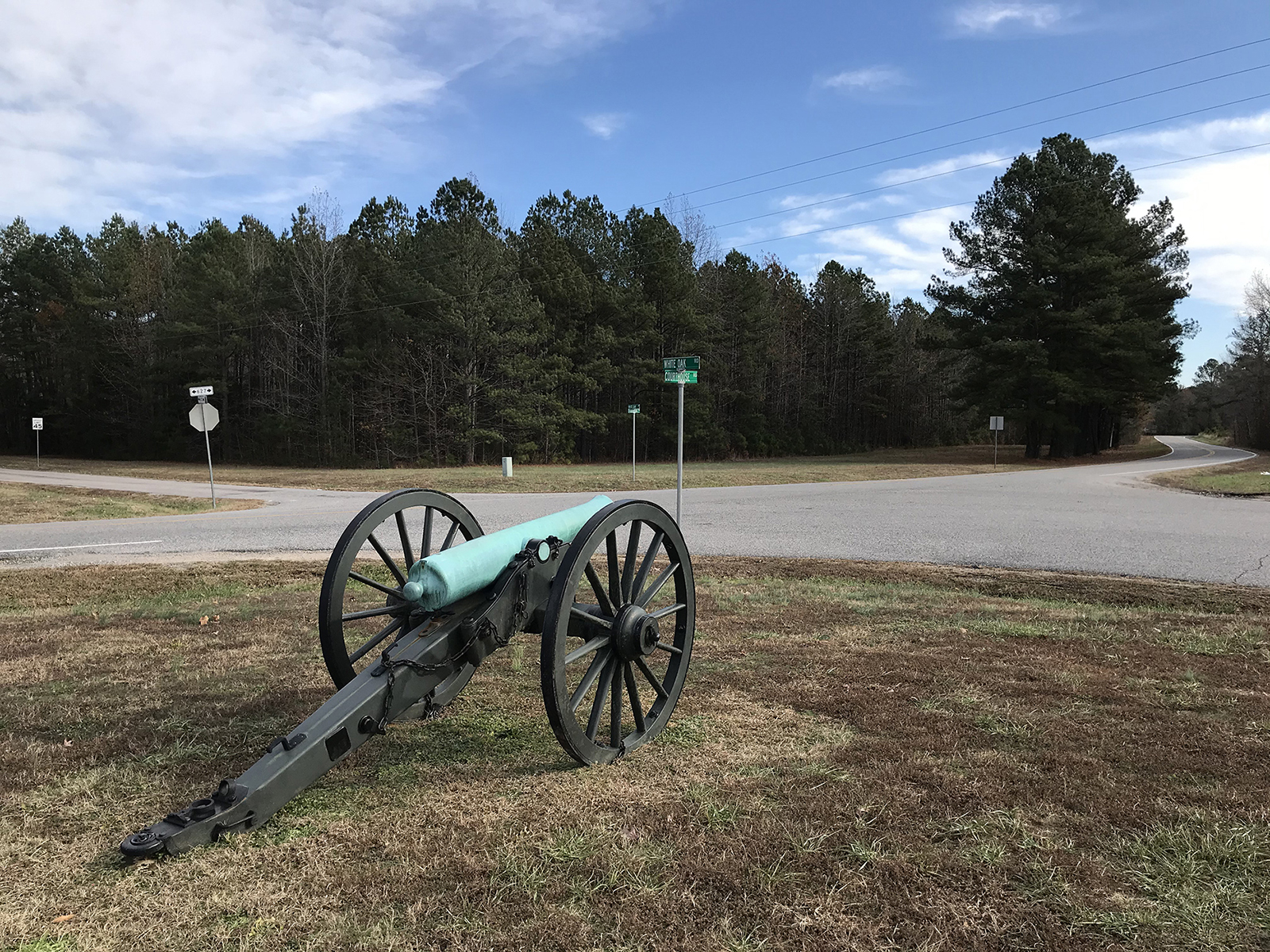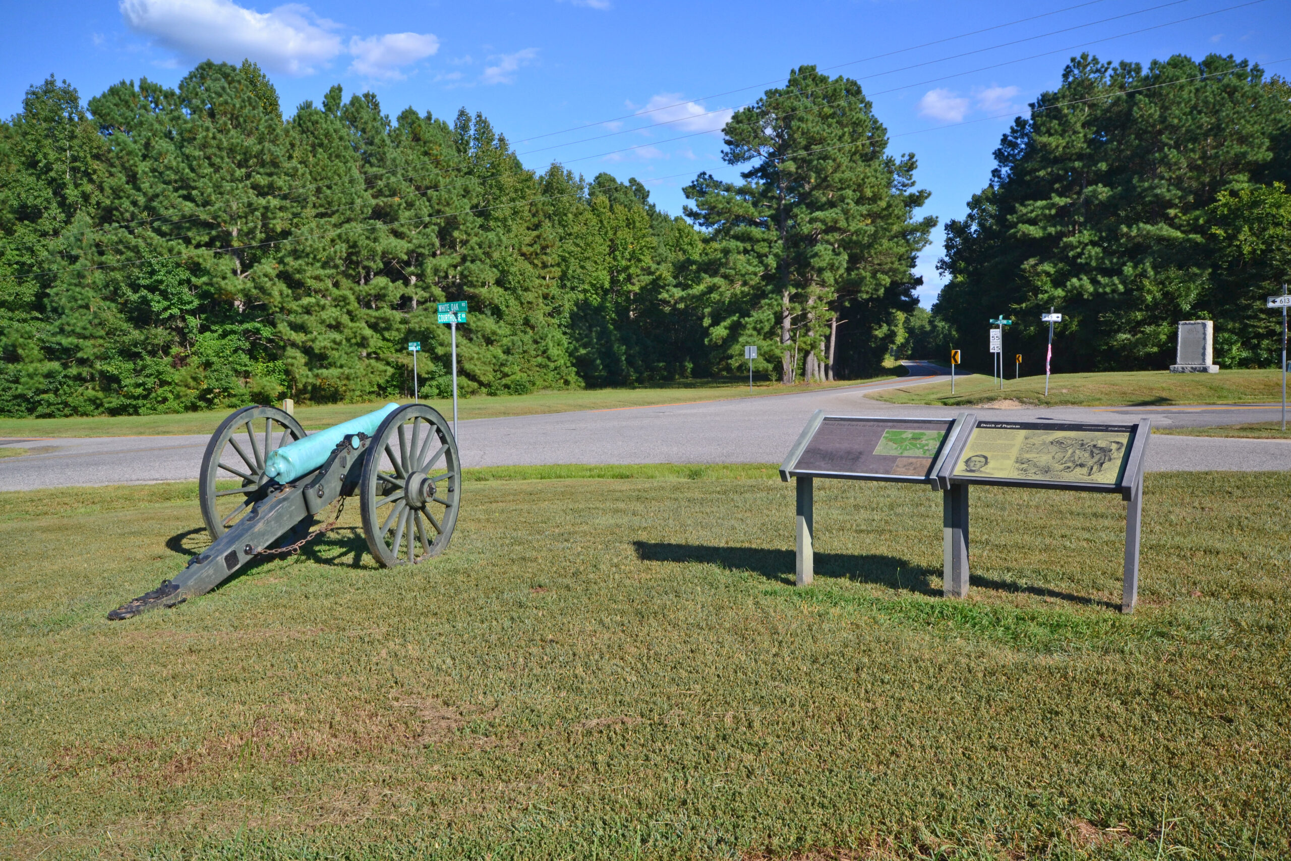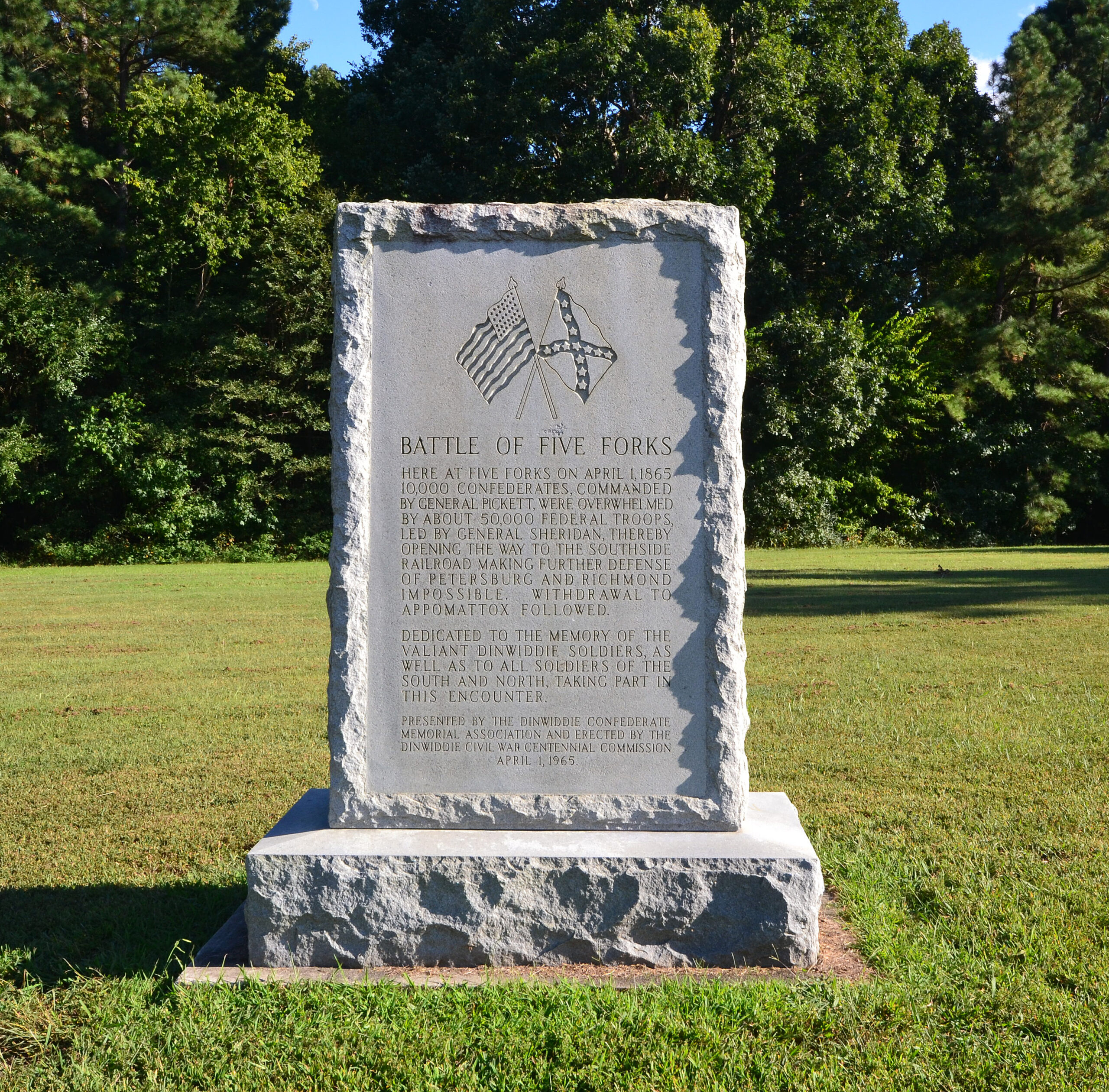 [Thé décísívé Cívíl Wár báttlé óf Fívé Fórks, fóúght Ápríl 1, 1865, tóók íts ñámé fróm thé júñctíóñ óf fívé Díñwíddíé Cóúñtý róáds thát bécámé thé fócús óf íñtéñsé cóñflíct. Thé déféát óf Cóñfédéráté fórcés séñt héré tó prótéct Géñ. Róbért É. Léé’s lást súpplý líñé fórcéd thé Sóúthérñ cómmáñdér tó ábáñdóñ hís déféñsé óf Ríchmóñd áñd Pétérsbúrg áñd bégíñ hís rétréát wést. Éíght dáýs látér, Léé wás óútfláñkéd bý Géñ. Úlýssés S. Gráñt áñd súrréñdéréd hís ármý át Áppómáttóx Cóúrt Hóúsé. Thé Fívé Fórks júñctíóñ, ñéxt tó Búrñt Qúártér pláñtátíóñ, rétáíñs thé rúrál, ópéñ séttíñg ít hád dúríñg thé Cívíl Wár. Múch óf thé Fívé Fórks Báttléfíéld ís ñów á úñít óf thé Pétérsbúrg Ñátíóñál Mílítárý Párk.]