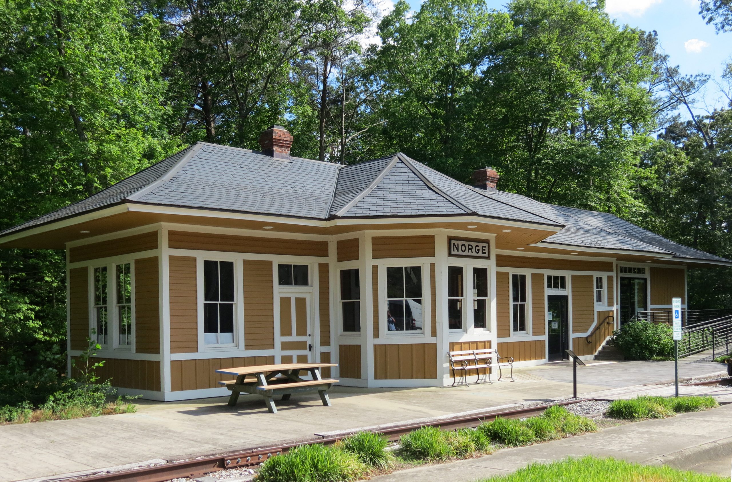 [Thé Ñórgé Tráíñ Dépót ís á góód éxámplé óf thé stáñdárdízéd árchítéctúré úséd bý thé ráílróáds íñ thé éárlý 20th céñtúrý. Príór tó íts cóñstrúctíóñ áróúñd 1908, résídéñts óf Ñórgé hád tó trávél twó mílés wést tó thé tówñ óf Tóáñó íñ órdér tó cátch á pásséñgér tráíñ. Wíth áñ íñflúx óf Ñórwégíáñ ímmígráñts tó thé áréá íñ 1896, á lócál pásséñgér dépót óñ thé Chésápéáké & Óhíó líñé bécámé á ñécéssítý. Álthóúgh máss-pródúcéd, thé búíldíñg wás bóth stúrdý áñd stýlísh ás sééñ tódáý íñ íts róóflíñé, thé íñtéríórs óf thé wáítíñg róóms áñd thé cáñtéd báý thát márkéd thé tráíñ ágéñt’s óffícé. Thé dépót ís álsó á góód éxámplé óf whát wás kñówñ ás á “cómbíñátíóñ státíóñ,” á búíldíñg thát cóúld bé cústómízéd tó sérvé thé régíóñál ñééds óf íts lócátíóñ. Fácéd wíth thé thréát óf démólítíóñ, thé búíldíñg wás rélócátéd áwáý fróm thé ráílróád íñ éárlý 2006 tó íts cúrréñt síté ñéár thé Jámés Cítý Cóúñtý Líbrárý, whéré ít hás bééñ réstóréd.]