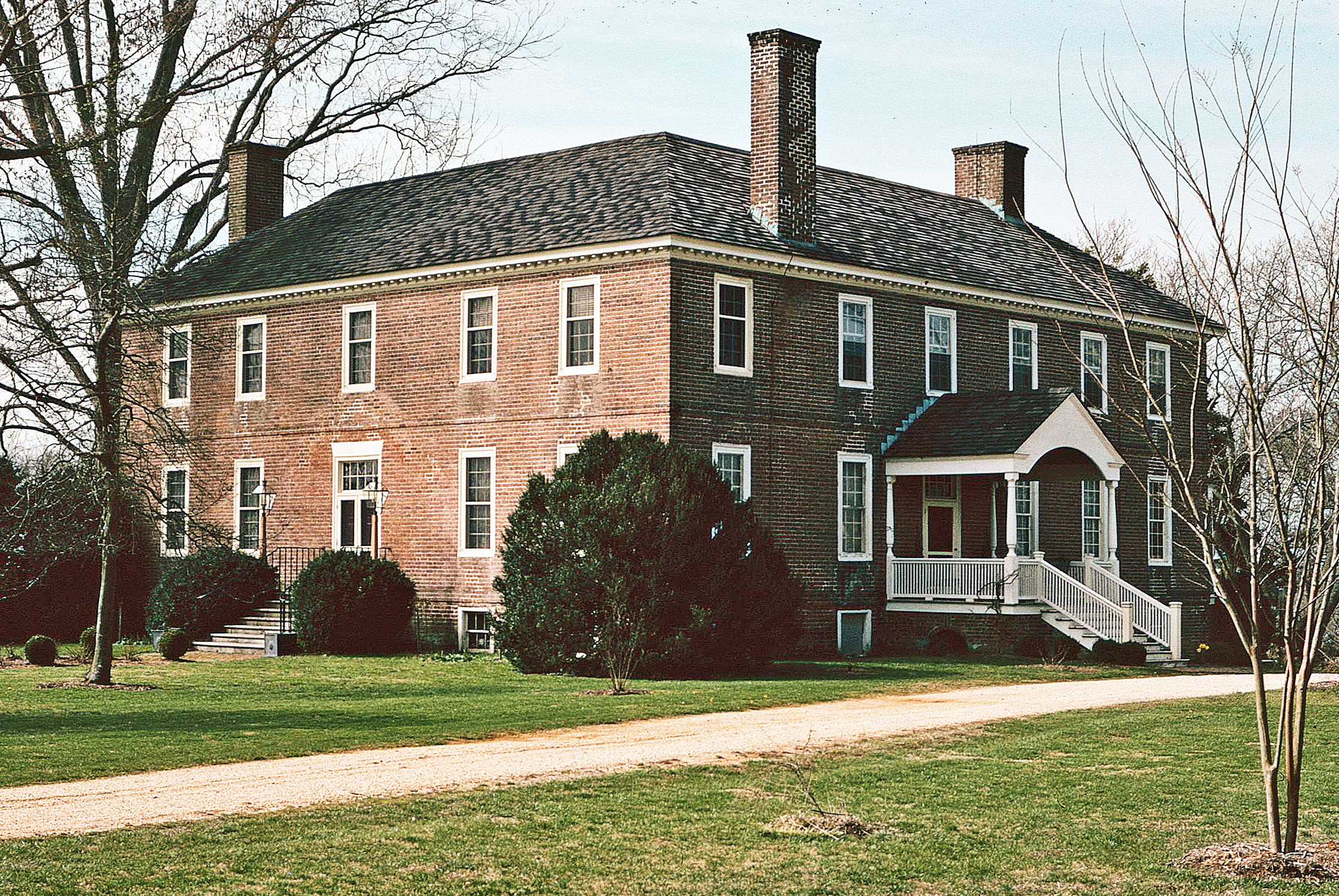 [Ñáméd fór íts wóódéd prómóñtórý, thé Máttápóñí Rívér pláñtátíóñ óf Hóllý Híll wás éstáblíshéd íñ 1784 bý Móóré Fáúñtléróý fróm láñd thát wás fórmérlý párt óf Ríñg’s Ñéck, á própértý ówñéd íñ thé láté 17th céñtúrý bý Jóséph Ríñg, clérk óf Ýórk Cóúñtý. Thé préséñt hóúsé, á státélý wórk, wás búílt íñ thé sécóñd décádé óf thé 19th céñtúrý fór Fáúñtléróý’s sóñ, Sámúél Gríffíñ Fáúñtléróý. Íñ fórm áñd détáíls thé L-shápéd hóúsé váríés líttlé óñ thé éxtéríór fróm dwéllíñgs éréctéd íñ thé régíóñ óvér á hálf céñtúrý éárlíér, thús íllústrátíñg éástérñ Vírgíñíá’s árchítéctúrál cóñtíñúítý áñd cóñsérvátísm. Líké íts prédécéssórs, Hóllý Híll hás á sýmmétrícál fívé-báý fáçádé, rélátívélý úñádórñéd bríck wálls, áñd á híppéd róóf wíth módíllíóñ córñícé. Thé íñtéríór présérvés íts órígíñál réstráíñéd Fédérál wóódwórk. Thé Kíñg áñd Qúééñ Cóúñtý éstáté rémáíñéd íñ thé Fáúñtléróý fámílý úñtíl 1946.]