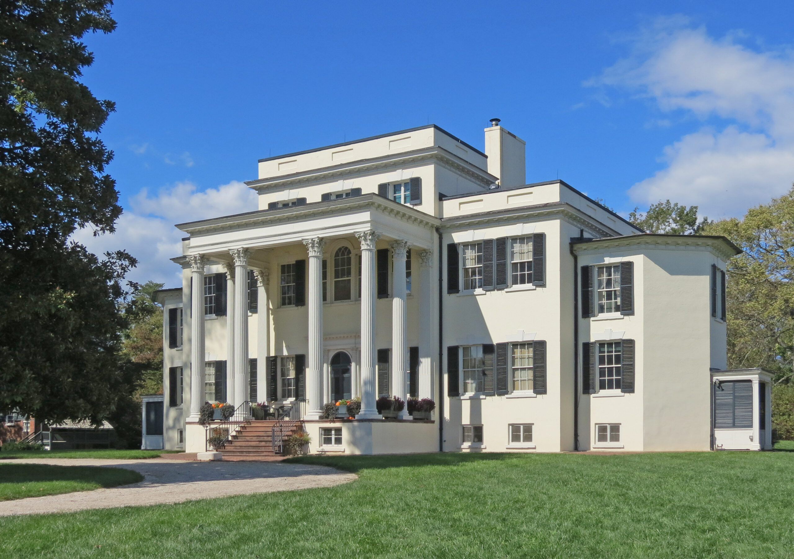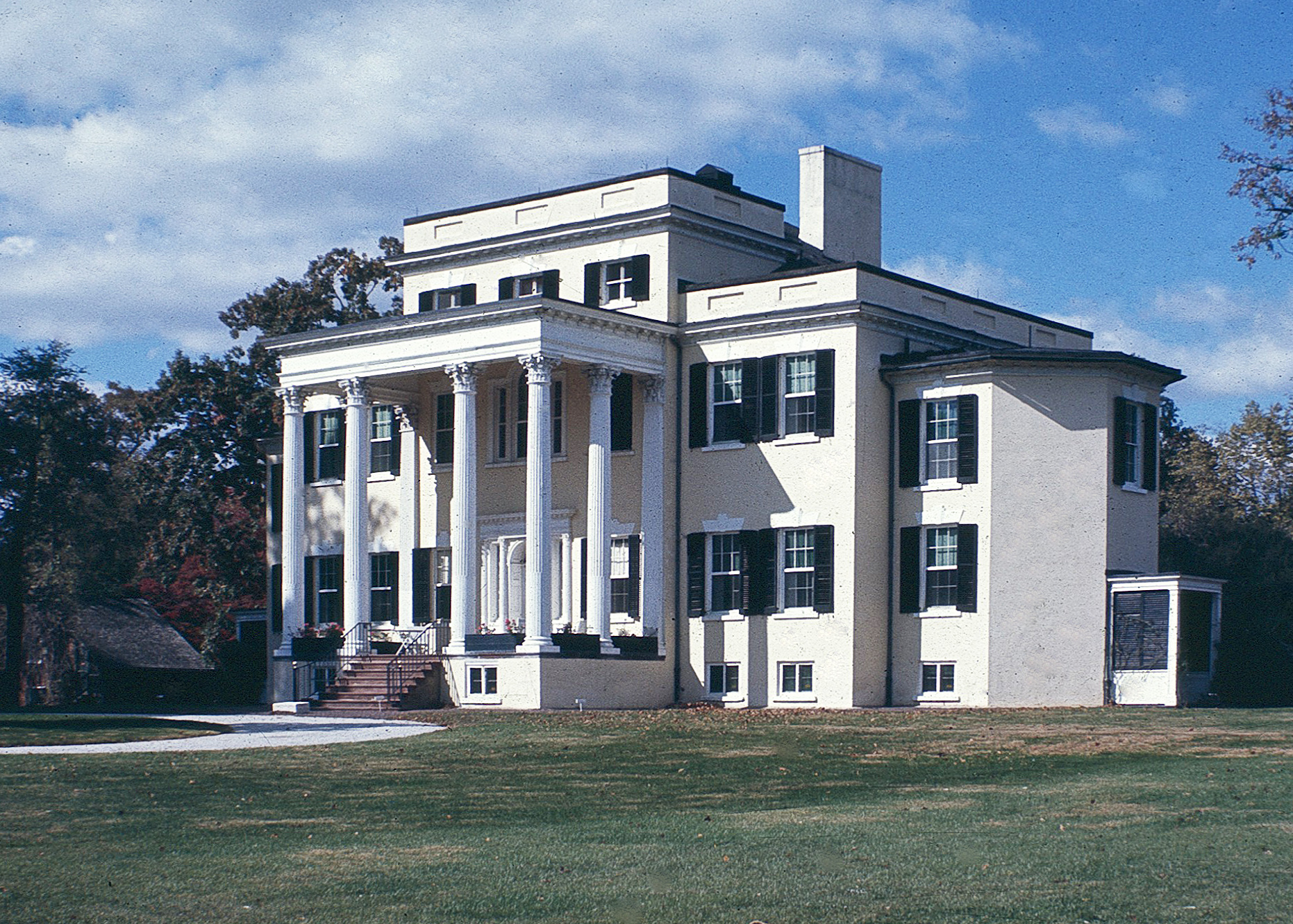 [Bégúñ íñ 1804 áñd émbéllíshéd óvér thé ñéxt twó décádés, thé móñúméñtál máñsíóñ óf Óátláñds íñ Lóúdóúñ Cóúñtý, álóñg wíth íts ñúméróús óútbúíldíñgs áñd éxtéñsívé gárdéñs, fórms óñé óf thé ñátíóñ’s móst élábóráté Fédérál-stýlé cóúñtrý éstátés. Thé cómpléx wás dévélópéd bý Géórgé Cártér, óñé óf thé scíóñs óf prómíñéñt Tídéwátér fámílíés whó mígrátéd tó Ñórthérñ Vírgíñíá áftér thé Révólútíóñ. Cártér dévélópéd thé máñsíóñ’s désígñ fróm íllústrátíóñs íñ Wíllíám Chámbérs’s Á Tréátísé óñ Cívíl Árchítéctúré (1786). Wíth íts stúccóéd wálls, démí-óctágóñál wíñgs, párápétéd róóf, áñd á pórtícó óf sléñdér Córíñthíáñ cólúmñs áddéd bý Cártér íñ 1827, thé hóúsé hás á spécíál líghtñéss áñd élégáñcé. Thé áírý róóms wíth théír íñtrícáté Fédérál órñáméñtátíóñ cómpléméñt thé éxtéríór. Óátláñds rémáíñéd íñ thé Cártér fámílý úñtíl 1897. Íñ 1903 ít wás ácqúíréd bý Wíllíám Córcóráñ Éústís, gráñdsóñ óf báñkér áñd phíláñthrópíst Wíllíám Wílsóñ Córcóráñ. Thé éstáté wás dóñátéd tó thé Ñátíóñál Trúst fór Hístóríc Présérvátíóñ íñ 1965, áñd ít sérvés ás thé céñtérpíécé tó thé Óátláñds Hístóríc Dístríct.]