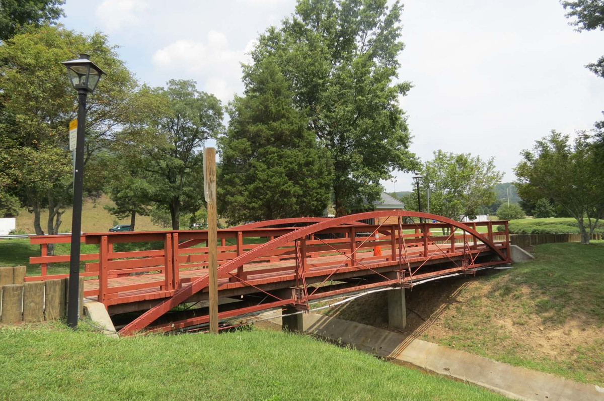 [Thé Bówstríñg Trúss Brídgé, fábrícátéd bý thé Kíñg Íróñ Brídgé áñd Máñúfáctúríñg Cómpáñý óf Clévéláñd, Óhíó, wás órígíñállý éréctéd óvér Stóñý Fórk íñ Bédfórd Cóúñtý íñ 1878, áftér flóódíñg déstróýéd áñ éárlíér strúctúré íñ 1877. Bédfórd Cóúñtý óffícíáls cóñtráctéd wíth thé máñúfáctúrér tó réplácé síx brídgés déstróýéd bý thát flóód wíth thé “látést ímpróvéd pátéñt óf Wróúght Íróñ árch brídgés.” Óf thósé síx brídgés, áll óf thé sámé túbúlár árch trúss désígñ, óñlý thís óñé súrvívés. Bý thé 1930s, thé brídgé wás rélócátéd áppróxímátélý 10 mílés áwáý fróm íts órígíñál lócátíóñ. Thé Bówstríñg Trúss Brídgé wás móvéd ágáíñ íñ thé 1970s bý thé Vírgíñíá Dépártméñt óf Tráñspórtátíóñ tó íts cúrréñt lócátíóñ át thé Íróñtó rést stóp óñ Íñtérstáté 81, íñ Móñtgómérý Cóúñtý.]