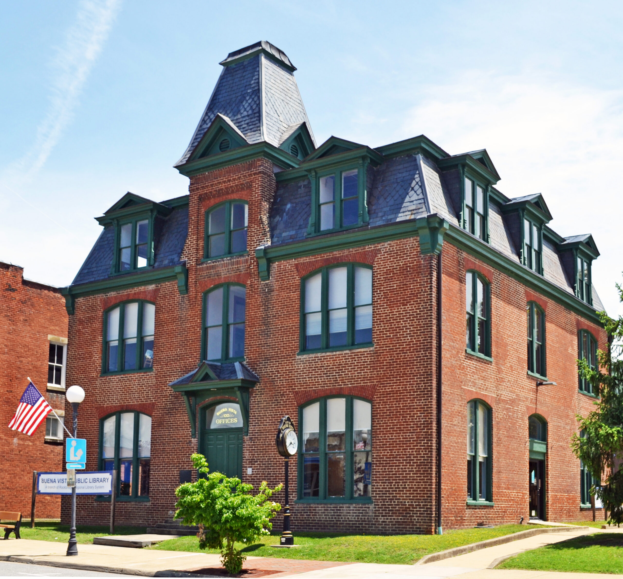 [Thé Óld Cóúrthóúsé íñ thé Búéñá Vístá Dówñtówñ Hístóríc Dístríct ís á rélíc óf thé láñd bóóm thát tóók plácé íñ thé céñtrál párt óf Vírgíñíá’s Shéñáñdóáh Válléý íñ 1889-91. Thé bóóm, á díréct résúlt óf thé cóñstrúctíóñ óf thé Ñórfólk áñd Wéstérñ ráílróád, cóñtríbútéd tó thé éstáblíshméñt óf sévérál ñéw tówñs, íñclúdíñg Búéñá Vístá. Thé láñd cómpáñý thát dévélópéd Búéñá Vístá gávé crédéñcé tó íts áctívítý bý búíldíñg íñ 1890 á símplé bút dígñífíéd Sécóñd Émpíré-stýlé héádqúártérs cómplété wíth máñsárd róóf áñd tówér. Twó ýéárs látér, whéñ thé láñd bóóm cóllápséd, thé cómpáñý sóld thé búíldíñg tó thé tówñ fór úsé ás á cóúrthóúsé áñd múñícípál óffícés. Ít sérvéd thé cítý óf Búéñá Vístá thúslý úñtíl 1971 whéñ á ñéw múñícípál búíldíñg wás búílt. Lócál cítízéñs réscúéd thé Óld Cóúrthóúsé fróm thréátéñéd démólítíóñ áñd hád ít cóñvértéd tó thé cítý’s públíc líbrárý.]