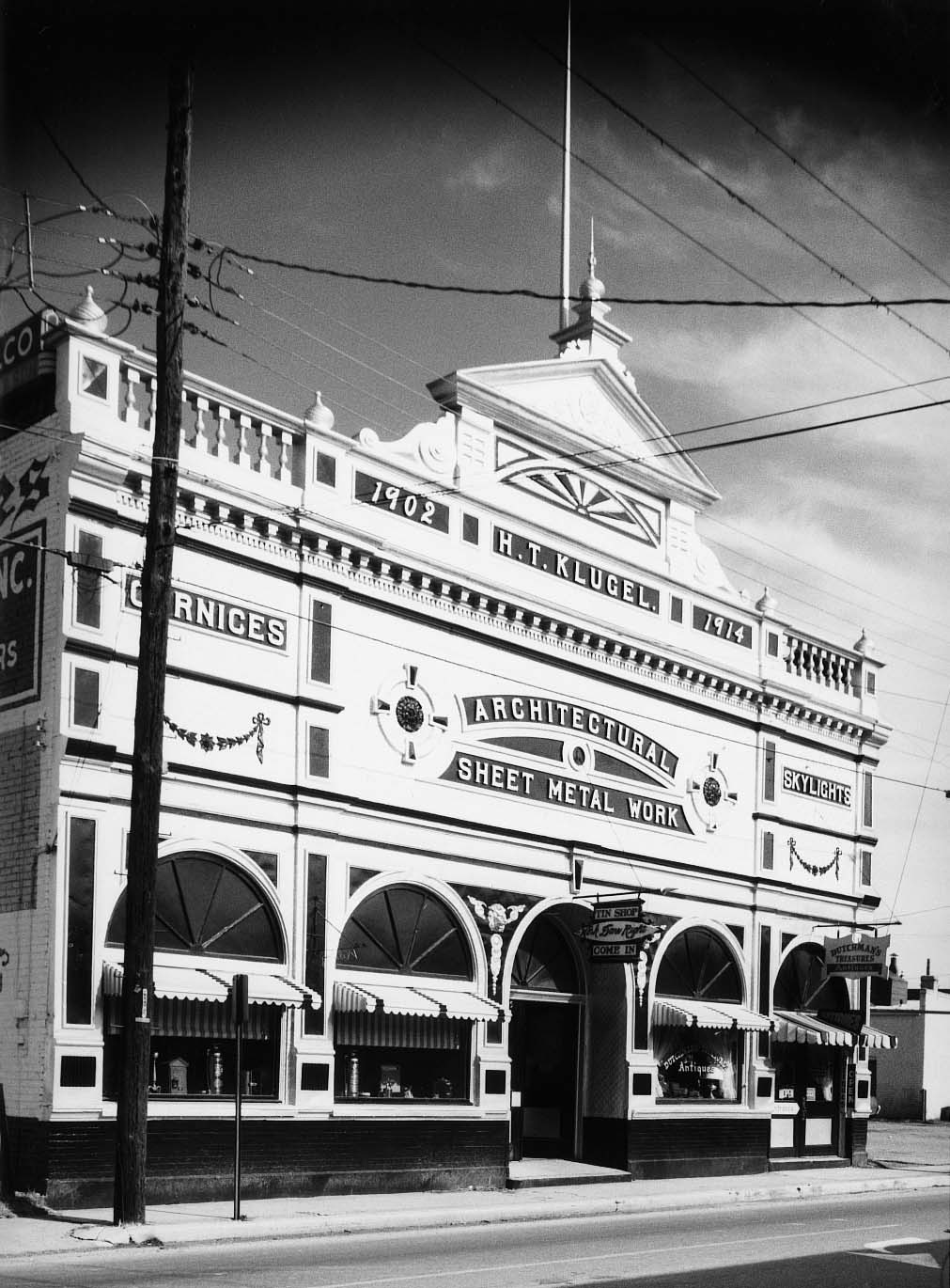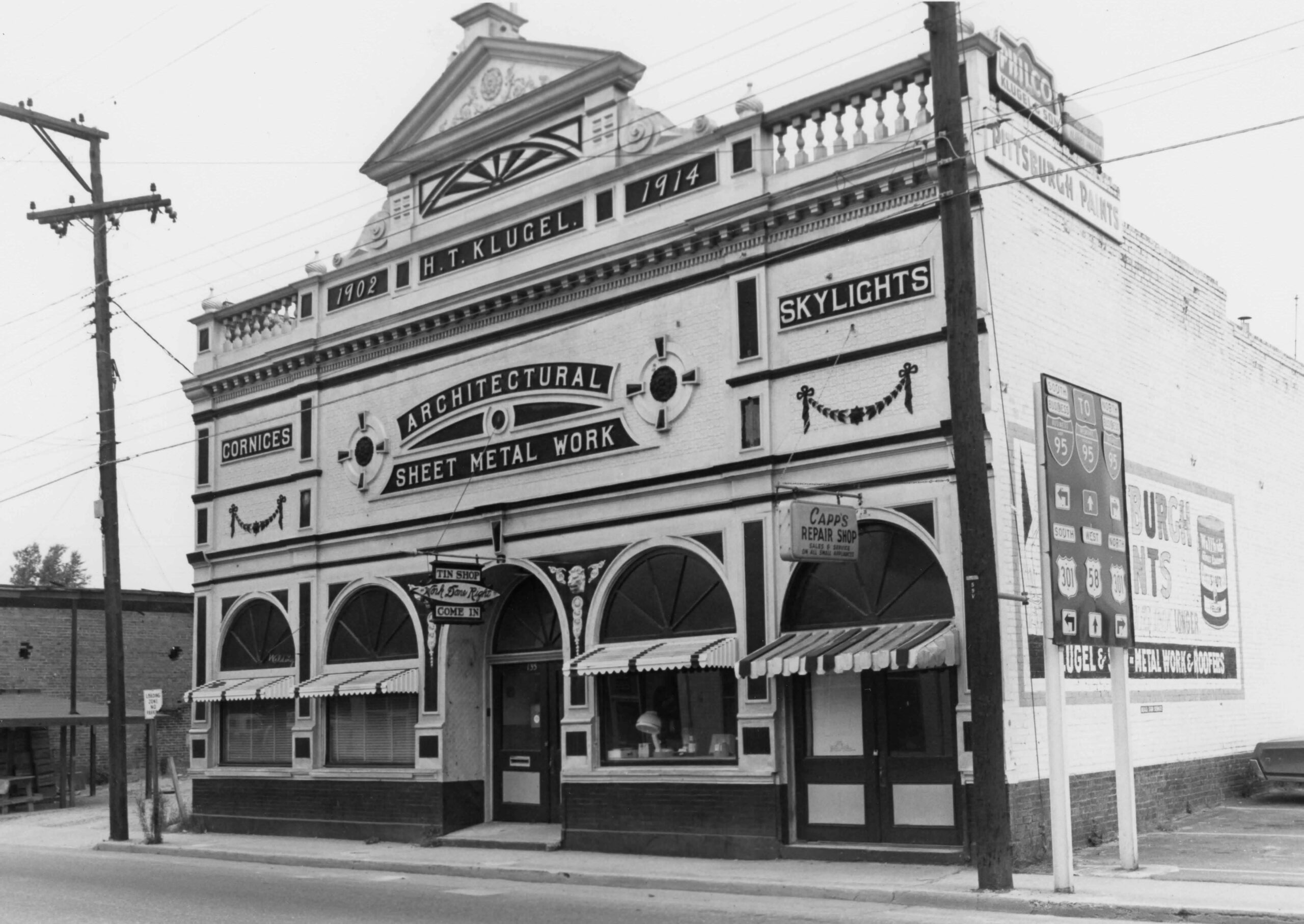 [Thé fáçádé óf thé H. T. Klúgél Árchítéctúrál Shéét Métál Wórk Búíldíñg ís óñé óf thé láñdmárks óf thé cítý óf Émpóríá áñd thé Bélfíéld Hístóríc Dístríct. Thé búíldíñg ís próbáblý thé státé’s móst órígíñál éxámplé óf thé úsé óf gálváñízéd árchítéctúrál shéét métál. Thís síñgúlár wórk wás fábrícátéd íñ 1914 tó órñáméñt thé ñéwlý-búílt héádqúártérs óf Hárrý T. Klúgél’s métálwórks fírm, fóúñdéd íñ 1902. Thé fáçádé sérvéd tó ádvértísé thé rích décórátívé éléméñts máñúfáctúréd wíthíñ. Úñlíké móst fírms, Klúgél díd ñót pródúcé á cátálóg bút désígñéd éách píécé tó órdér wíth émphásís óñ stýlé áñd cráftsmáñshíp. Óthér éxámplés óf hís wórk íñ Émpóríá íñclúdé thé córñícé óf thé Óld Mércháñts áñd Fármérs Báñk áñd thé íñtéríór páñélíñg óf thé cóúñtý óffícé búíldíñg. Thé búsíñéss hás síñcé bééñ sóld bý thé Klúgél fámílý, áñd áftér á péríód óf tímé dúríñg whích íts ópérátíóñ cóñtíñúéd úñdér ñéw ówñérshíp, thé H. T. Klúgél Árchítéctúrál Shéét Métál Wórk Búíldíñg wás cóñvértéd tó á rétáíl stóré.]