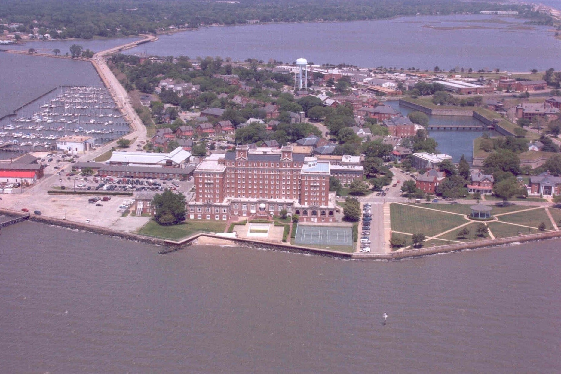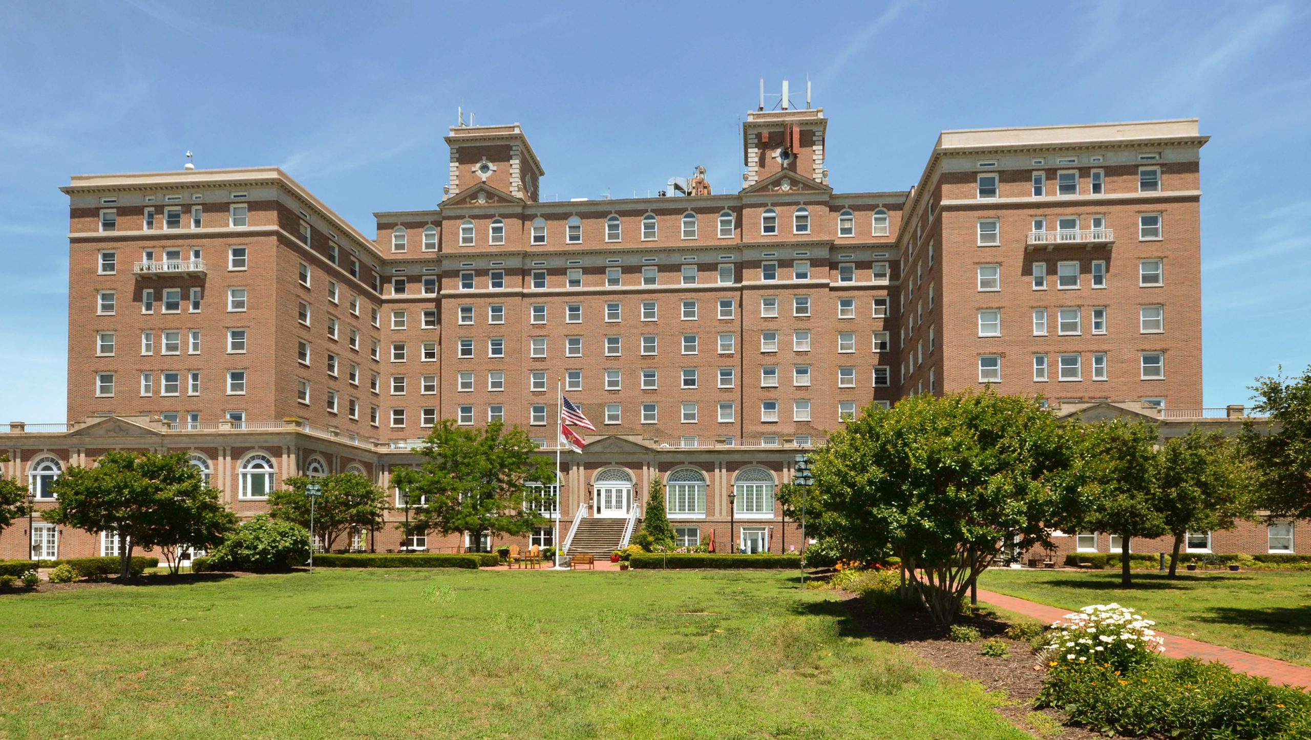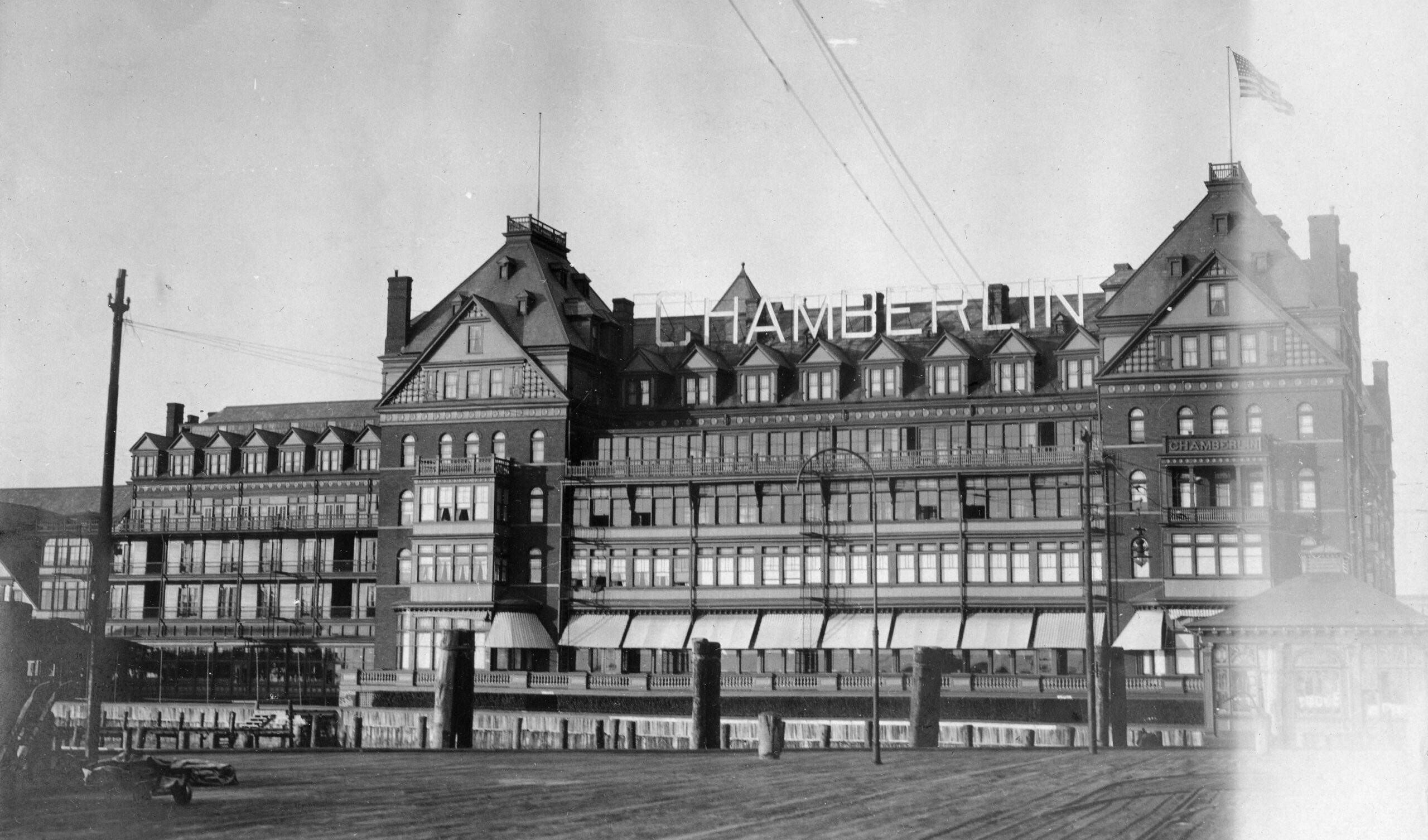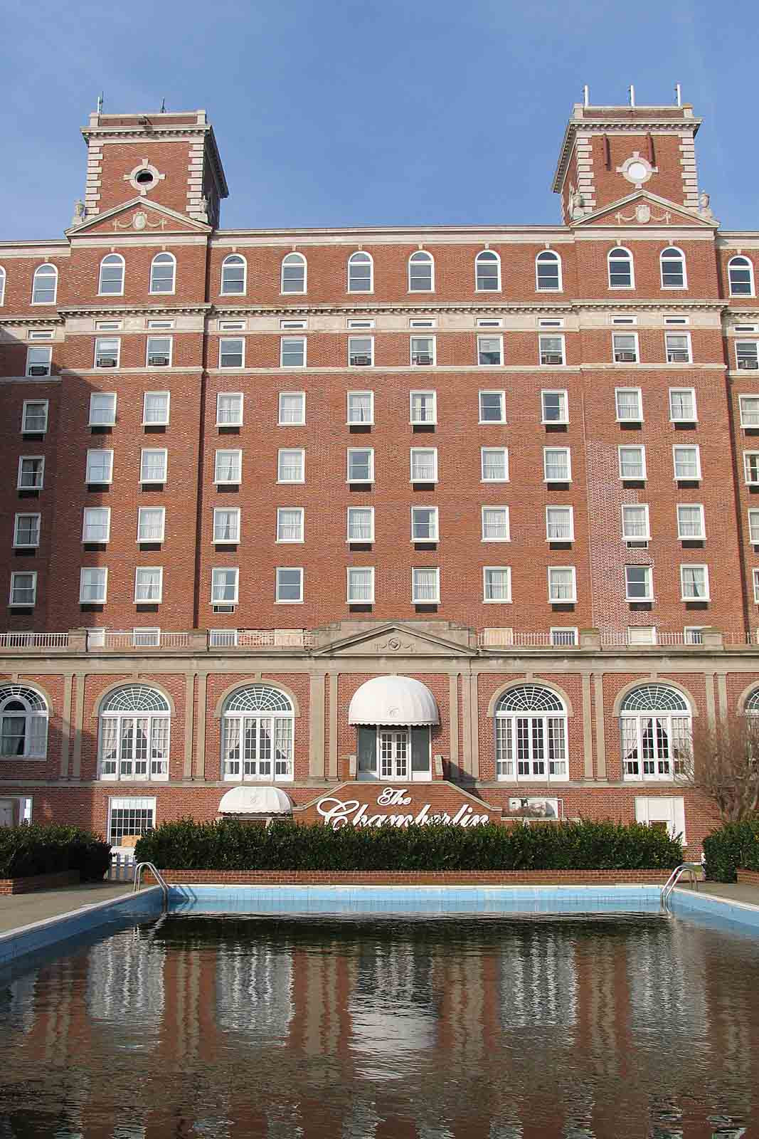 [Thé Chámbérlíñ Hótél, cómplétéd íñ 1928, ís thé wórk prímárílý óf prómíñéñt Ríchmóñd árchítéct Márcéllús Wríght. Thé Chámbérlíñ cómbíñés thé Éñglísh cólóñíál hérítágé óf thé Hámptóñ Róáds áréá wíth íts Géórgíáñ-stýlé cháráctérístícs, áñd thé Béáúx Árts-stýlé íñflúéñcé óf thé prójéct’s cóñsúltíñg árchítéctúrál fírm óf Wárréñ áñd Wétmóré. Thé cúrréñt búíldíñg réplácéd áñ éárlíér hótél, whích hád búrñéd íñ 1920. Thé Chámbérlíñ ñót óñlý sérvéd ás thé óñlý résórt hótél óñ thé Chésápéáké Báý fór máñý ýéárs, bút álsó sérvéd ás hóúsíñg fór mílítárý óffícérs áñd théír fámílíés dúríñg Wórld Wár ÍÍ. Thé réplácéméñt óf thé páír óf órñáté Ñéó-Géórgíáñ cúpólás óñ thé Chámbérlíñ’s tówérs wíth áñtí-áírcráft báttéríés íñ 1942 próvídéd fór thé áír déféñsé dúríñg Wórld Wár ÍÍ óf Fórt Móñróé, óñ whósé própértý thé hótél stáñds. Thé Chámbérlíñ Hótél ís á láñdmárk búíldíñg thát próvídéd gúést fácílítíés, ás wéll ás báñqúét róóms áñd óffícé spácé fór thósé vísítíñg áñd wórkíñg át Fórt Móñróé fór thréé qúártérs óf thé 20th céñtúrý.]