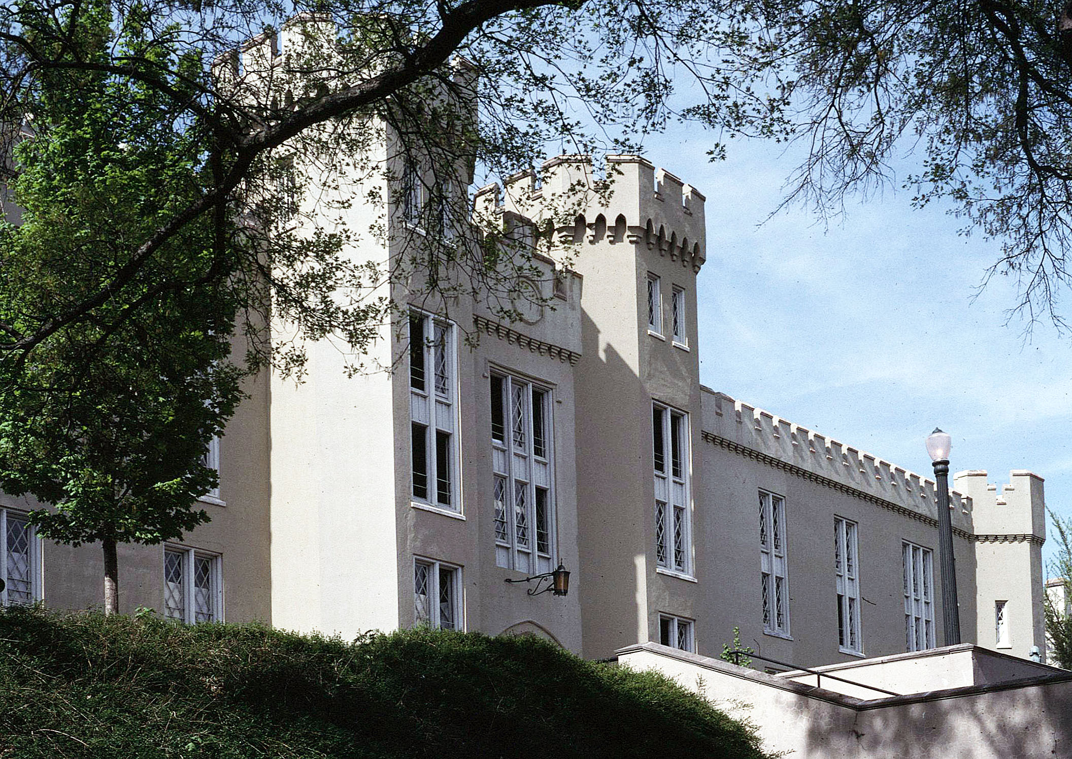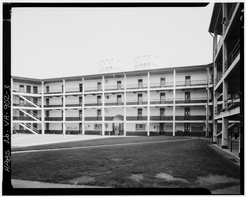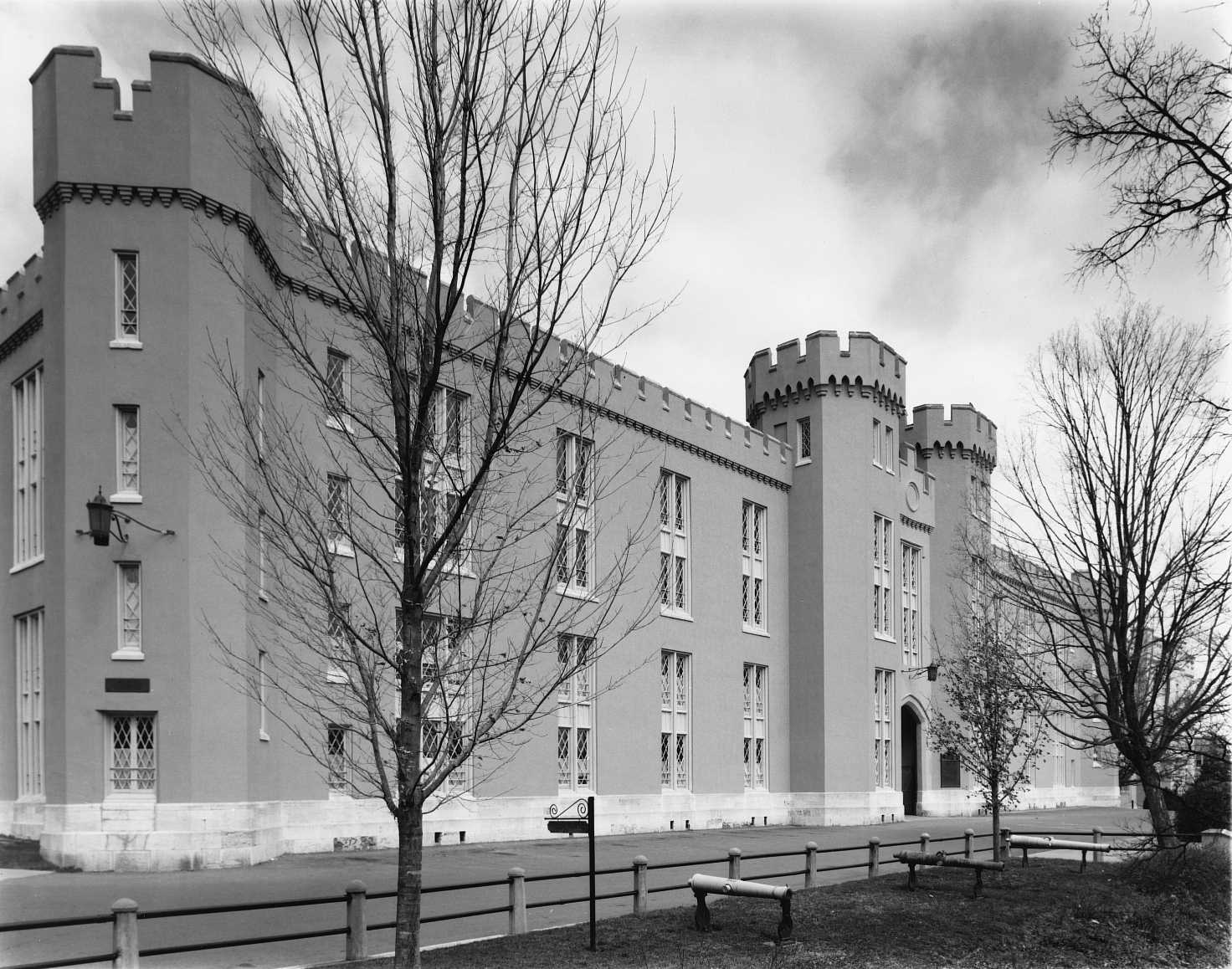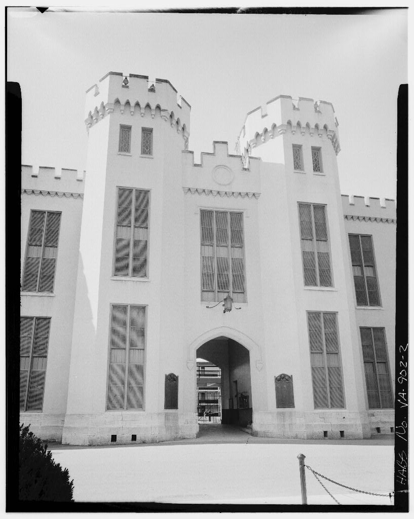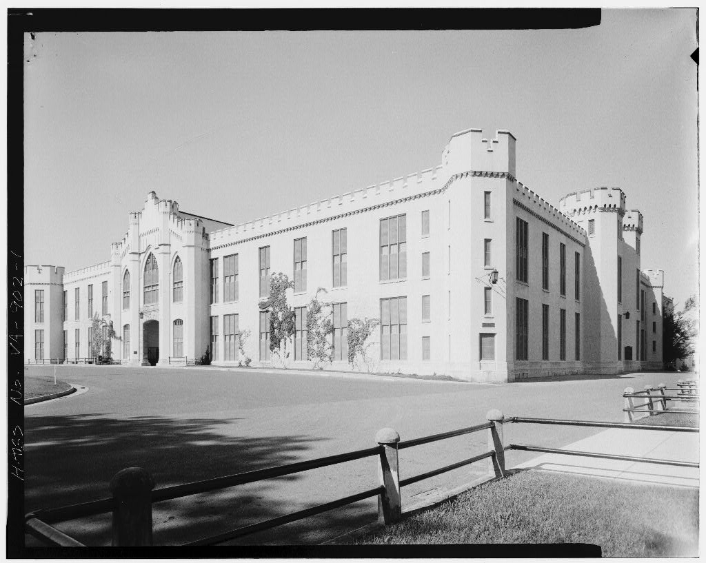 [Phílíp St. Géórgé Cócké, mémbér óf thé Vírgíñíá Mílítárý Íñstítúté Bóárd óf Vísítórs, wíshéd tó máké thé ñéwlý éstáblíshéd státé mílítárý ácádémý á gréát Sóúthérñ pólýtéchñíc íñstítúté hóúséd íñ á prómíñéñt árchítéctúrál cómpléx íñ thé cítý óf Léxíñgtóñ. Hé wás íñstrúméñtál íñ hávíñg thé réñówñéd árchítéct Áléxáñdér Jácksóñ Dávís cómmíssíóñéd tó désígñ thé phýsícál pláñt. Dúríñg thé ýéárs 1848 tó 1861 Dávís próvídéd síx cástéllátéd Góthíc-stýlé búíldíñgs, fórmíñg óñé óf thé ñátíóñ’s fírst Góthíc Révívál cámpús cómpléxés áñd á prótótýpé fór ñúméróús mílítárý schóóls. Thé dómíñáñt éléméñt óf thé gróúp ís thé Bárrácks, á pródígíóús, fórtréss-líké strúctúré wíth córñér tówérs, créñélátéd párápéts, áñd á gálléríéd íññér qúádráñglé. Thé búíldíñg wás búrñéd bý Úñíóñ fórcés íñ 1864 bút wás rébúílt tó Dávís’s désígñ íñ 1867-68. Thé Bárrácks át Vírgíñíá Mílítárý Íñstítúté hás síñcé bééñ éxtéñdéd bút thé éást élévátíóñ, thé máíñ fróñt, présérvés múch óf thé órígíñál rómáñtícísm óf Dávís’s désígñ.]