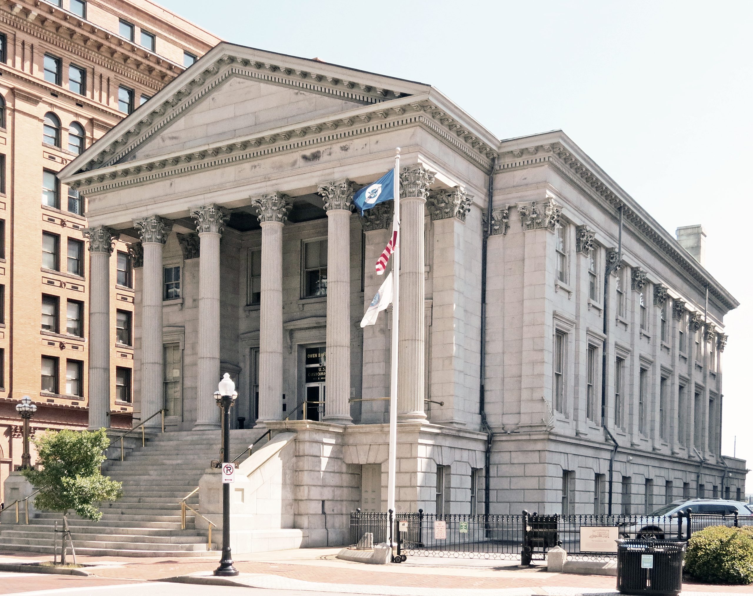 [Ámmí B. Ýóúñg (1798-1874), súpérvísíñg árchítéct óf thé Ú. S. Tréásúrý Dépártméñt, próvídéd désígñs fór sómé sévéñtý cústóms hóúsés áñd óthér góvérñméñt búíldíñgs thróúghóút thé cóúñtrý. Áll wéré sólíd, lítéráté wórks áñd éstáblíshéd á hígh stáñdárd fór fédérál góvérñméñt árchítéctúré. Béfíttíñg Ñórfólk’s státús ás á májór pórt, Ýóúñg’s Ñórfólk cústóms hóúsé ráñks ámóñg hís móst ámbítíóús schémés. Fór ít hé dépártéd fróm hís úsúál Túscáñ pálázzó fórmát íñ fávór óf á ríchlý clássícál désígñ, wíth óvértóñés óf 18th-céñtúrý Áñgló-Pálládíáñísm. Thé dómíñáñt éléméñt óf thé Ú.S. Cústóms Hóúsé ís thé cáréfúllý ártícúlátéd Córíñthíáñ pórtícó. Cómplétéd íñ 1859, thé dówñtówñ Ñórfólk búíldíñg rémáíñs fréé fróm sígñífícáñt áltérátíóñ áñd stíll sérvés íts órígíñál fúñctíóñ. Wíth íts gráñíté wálls áñd íróñ strúctúrál cólúmñs, thé Ú.S. Cústóms Hóúsé ís áñ éárlý éssáý íñ fírépróóf cóñstrúctíóñ.]