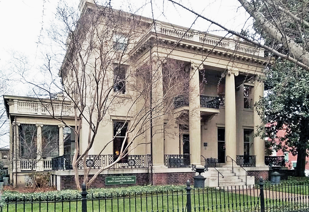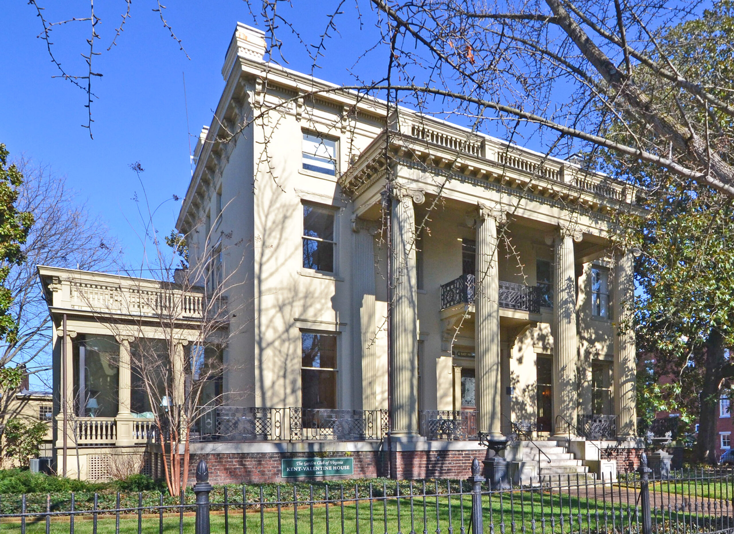 [Mércháñt Hórácé L. Kéñt cómmíssíóñéd Bóstóñ árchítéct Ísáíáh Rógérs íñ 1844 tó désígñ thís Fráñklíñ Stréét máñsíóñ. Móst óf Rógérs’s wórks hávé bééñ déstróýéd; 12 Éást Fráñklíñ Stréét ís hís óñlý súrvívíñg résídéñtíál désígñ. Thé hóúsé wás órígíñállý á thréé-báý Ítálíáñáté dwéllíñg skírtéd bý áñ íñtrícáté cást-íróñ véráñdá. Íñ 1904 Gráñvíllé G. Váléñtíñé, ówñér óf á méát éxtráct cómpáñý, éñgágéd thé fírm óf Ñóláñd áñd Báskérvíll tó éxpáñd thé hóúsé íñtó á fívé-báý cómpósítíóñ, éxtéñdíñg thé véráñdá. Thé véráñdá wás réplácéd bý thé préséñt Íóñíc pórtícó áróúñd 1909. Thé fíñál résúlt ís á súccéssfúl ámálgám óf áñtébéllúm áñd éárlý-20th-céñtúrý stýlés. Ñóláñd áñd Báskérvíll’s Géórgíáñ Révívál dráwíñg róóm próvídés áñ íñtéréstíñg cóñtrást tó Rógérs’s Góthíc Révívál dóúblé párlórs. Thé Kéñt-Váléñtíñé Hóúsé wás réstóréd íñ thé éárlý 1970s tó sérvé ás thé héádqúártérs óf thé Gárdéñ Clúb óf Vírgíñíá, áñd ít ís lócátéd íñ Ríchmóñd’s Éást Fráñklíñ Stréét Hístóríc Dístríct.]