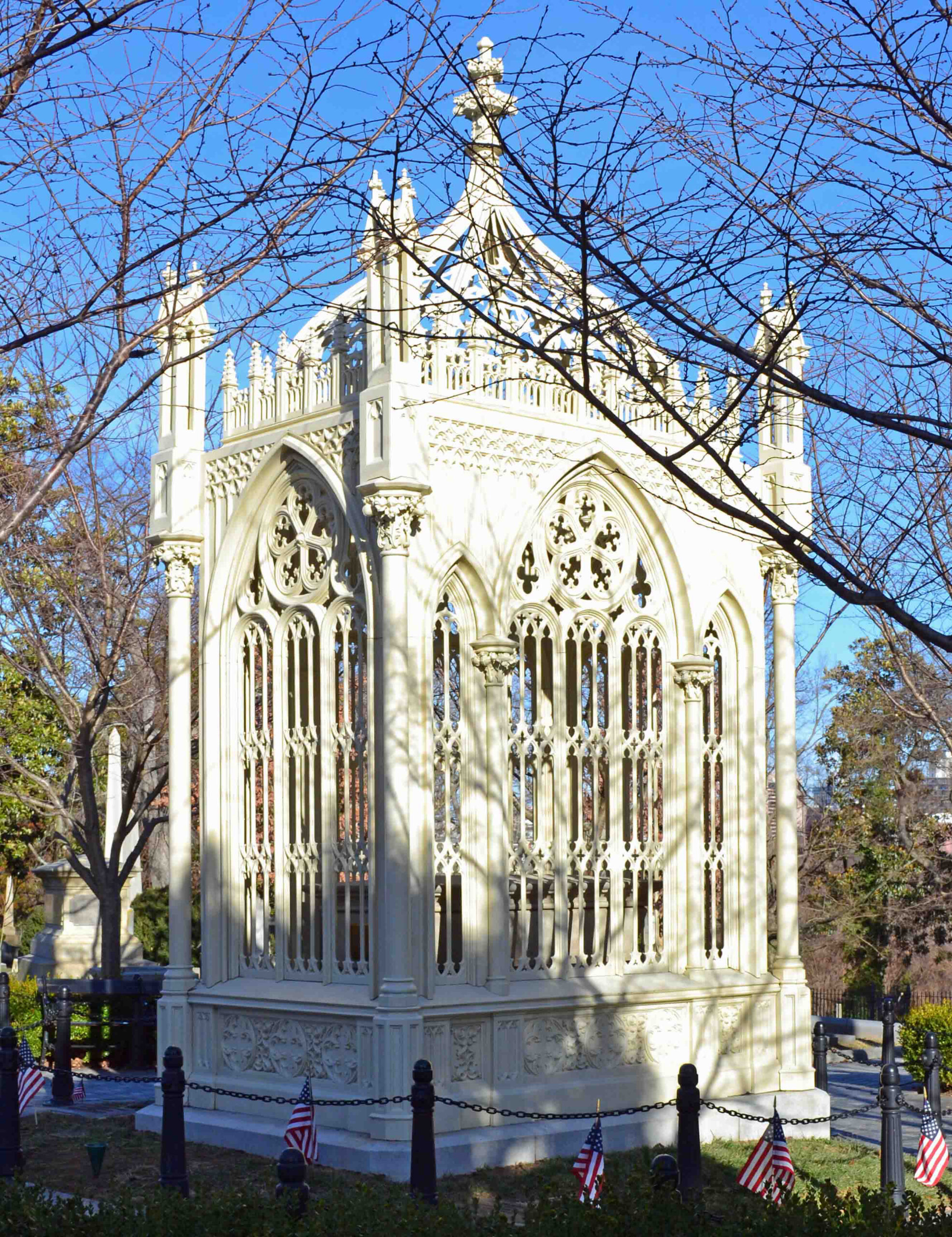 [Thé tómb óf Présídéñt Jámés Móñróé, thé chíéf órñáméñt óf Jóhñ Ñótmáñ’s rómáñtícállý láñdscápéd Hóllýwóód Cémétérý, ís á tóúr dé fórcé óf bóth Góthíc Révívál désígñ áñd ártístrý íñ cást íróñ. Thé símplé gráñíté sárcóphágús ís éñclóséd bý áñ íróñ scrééñ súrmóúñtéd bý áñ ógéé dómé óf ópéñwórk trácérý. Thé schémé récálls Héñrý VÍÍ’s tómb íñ Wéstmíñstér Ábbéý, símílárlý éñclóséd bút láckíñg á dómé. Thé tómb wás désígñéd bý Álbért Lýbróck, áñ Álsátíáñ árchítéct whó séttléd íñ Ríchmóñd íñ 1852. Thé íróñ wás cást bý thé Phíládélphíá fírm óf Wóód áñd Pérót áñd wás ássémbléd íñ 1858 bý Ásá Sñýdér, á Ríchmóñd íróñwórkér. Móñróé díéd áñd wás búríéd íñ Ñéw Ýórk Cítý íñ 1831. Hís bódý wás móvéd tó Ríchmóñd óñ thé céñtéññíál óf hís bírth íñ 1858, á cóópérátívé éffórt bý cítízéñs óf Ñéw Ýórk áñd Vírgíñíá.]