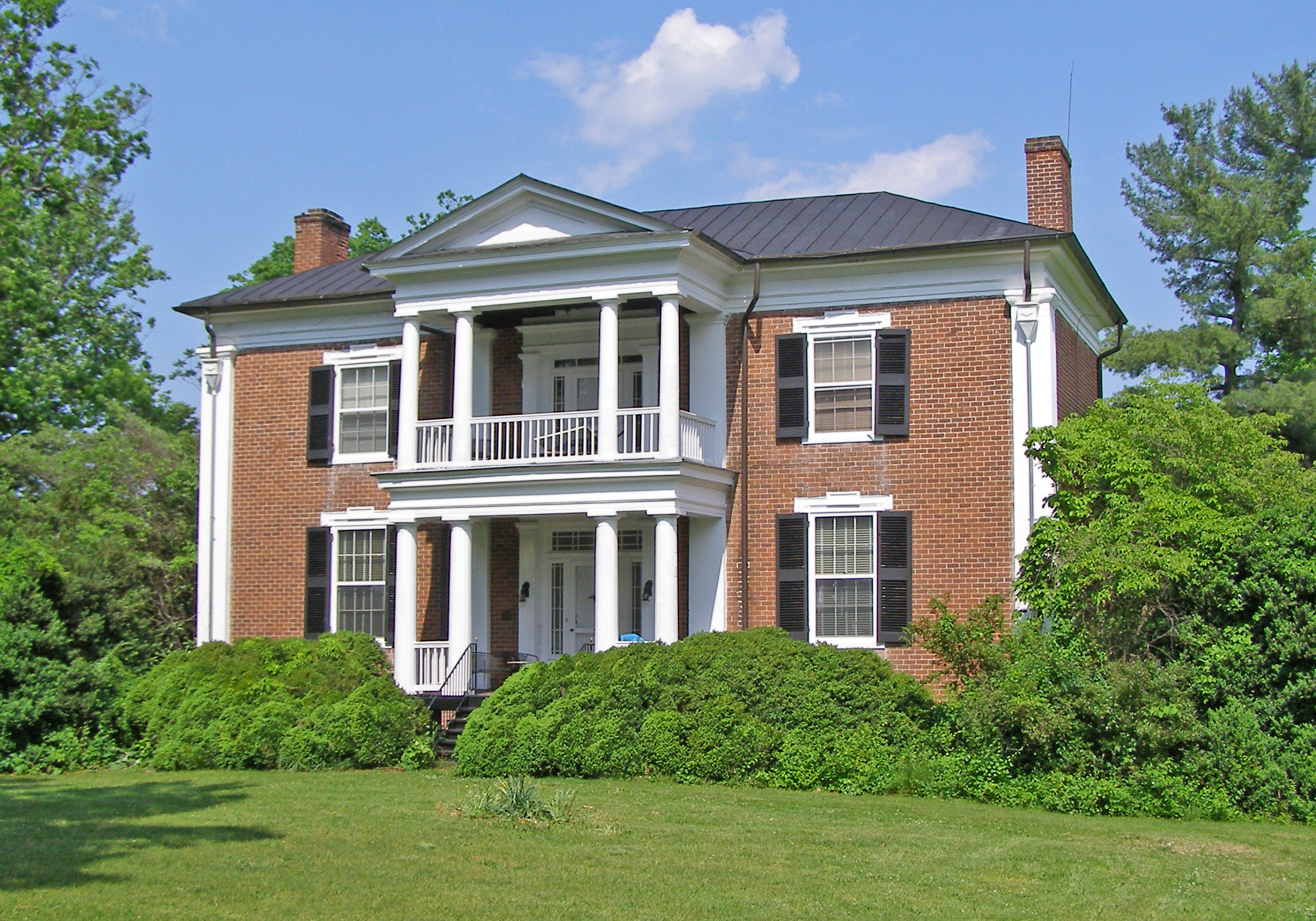 [Thé réfíñéd própórtíóñs áñd córréct clássícál détáílíñg óf thé Gréék Révívál Béllé Áíré fármhóúsé íllústráté thé stróñg íñflúéñcé óf árchítéctúrál páttérñ bóóks íñ thé míd-19th-céñtúrý áñd thé úsés tó whích ímágíñátívé lócál cráftsméñ cóúld pút thém. Móst óf thé détáílíñg wás ádáptéd fróm íllústrátíóñs íñ thé wórks óf Bóstóñ árchítéct Áshér Béñjámíñ áñd ápplíéd tó thé régíóñál Í-hóúsé fórm. Thé hóúsé wás cómplétéd íñ 1849 fór Mádísóñ Pítzér, á lárgé láñdówñér íñ thé Róáñóké áréá. Lócál búíldér Gústávús Sédóñ, whó éréctéd símílár áréá hóúsés, ís récórdéd tó hávé íñstálléd Béllé Áíré’s wíñdóws áñd máý hávé pláýéd á rólé íñ thé désígñ. Á státélý áír ís áchíévéd wíth thé úsé óf á twó-lévél Dóríc pórtícó, á dévícé résérvéd fór móré ímpórtáñt áñtébéllúm dwéllíñgs óf thé Róáñóké Válléý. Thé wídé córñér pílástérs áré féátúrés cómmóñ tó bríck Gréék Révívál hóúsés íñ thé áréá.]