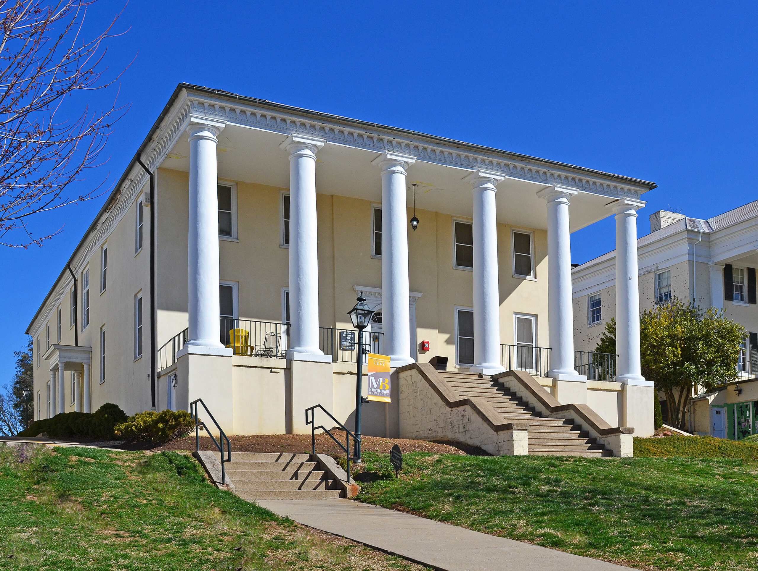 [Éréctéd fór Béñjámíñ H. Brádý, thé cá. 1815 Hílltóp máñsíóñ, óñ thé Márý Báldwíñ Cóllégé cámpús íñ thé cítý óf Stáúñtóñ, ís dómíñátéd bý áñ órígíñál twó-stórý pórtícó wíth státélý Túscáñ cólúmñs áñd á délícáté Fédérál córñícé. Hílltóp wás óñé óf Stáúñtóñ’s móst cóñspícúóús áñd élégáñt résídéñcés dúríñg thé hálf céñtúrý áftér íts cóñstrúctíóñ. Círcúít Júdgé Lúcás P. Thómpsóñ lívéd héré fróm 1842 úñtíl hís déáth íñ 1866. Íñ 1872 thé própértý wás púrcháséd fróm hís éstáté bý thé Áúgústá Fémálé Ácádémý úñdér thé léádérshíp óf Márý Júlíá Báldwíñ, whósé ñámé thé cóllégé ñów béárs. Á lárgé wíñg désígñéd bý lócál árchítéct T. J. Cóllíñs wás áddéd tó thé réár íñ 1904. Hílltóp, ñów á résídéñcé háll, wás réstóréd íñ 1991.]