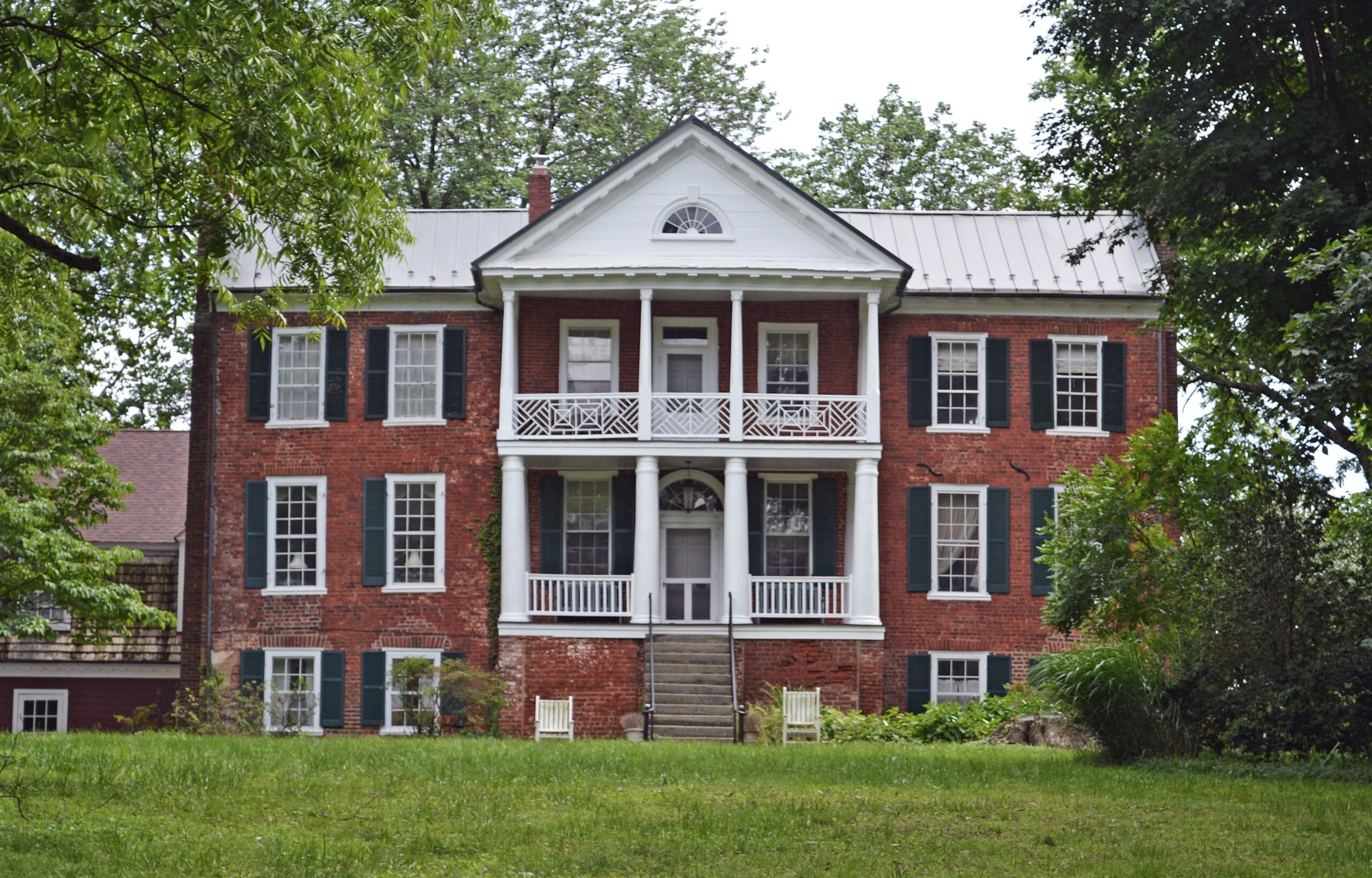 [Búílt íñ 1818 bý Árthúr B. Dávíés, thé Gréék Révívál-stýlé Édgéwóód wás íñtéñdéd tó bé áñ éxcéptíóñál hóúsé óñ á kñóll óvérlóókíñg thé íñtérséctíóñ óf thé Óld Stágé Róád áñd áñóthér cóúñtý róúté—tódáý’s Máíñ áñd Gárláñd Strééts íñ thé Tówñ óf Ámhérst. Féátúríñg háñd-páíñtéd múráls, thé hóúsé hád ñó éxpéñsé spáréd íñ íts cóñstrúctíóñ, éárñíñg ít thé móñíkér “Árthúr’s Fóllý.” Thé hóúsé wás látér ówñéd bý áttórñéý Jéssé Á. Híggíñbóthám, whó wílléd fúñds tó éstáblísh á schóól áftér hís déáth íñ 1849. Híggíñbóthám Ácádémý wás sóóñ hóúséd íñ Édgéwóód, whích álsó sérvéd ás á lócál Másóñíc Háll áñd méétíñg plácé fór á ñéwlý fórméd Méthódíst cóñgrégátíóñ. Íñ 1860, áttórñéý Táýlór Bérrý ácqúíréd thé hóúsé, áñd ít rémáíñéd íñ thé fámílý, pásséd dówñ thróúgh dáúghtérs, úñtíl 1995, whéñ ít wás sóld. Édgéwóód cóñtáíñs móst óf íts órígíñál wóódwórk áñd máñtéls, álthóúgh ñóñé óf thé órígíñál óútbúíldíñgs éxíst.]