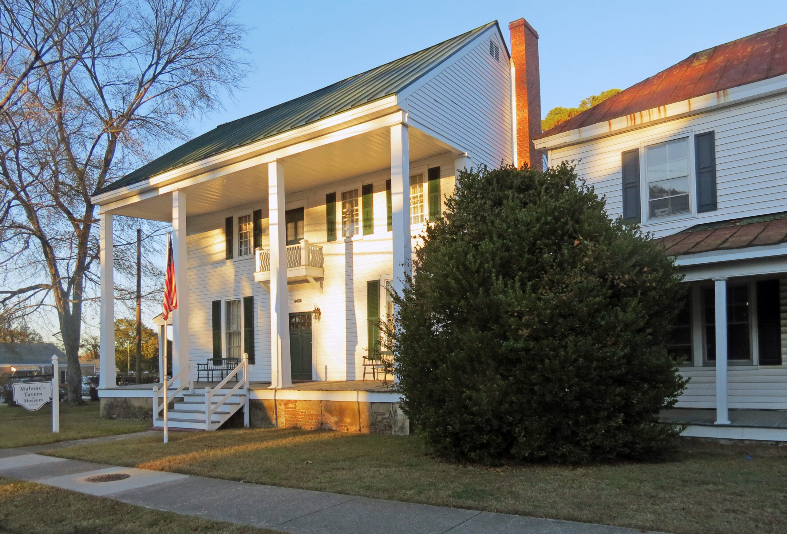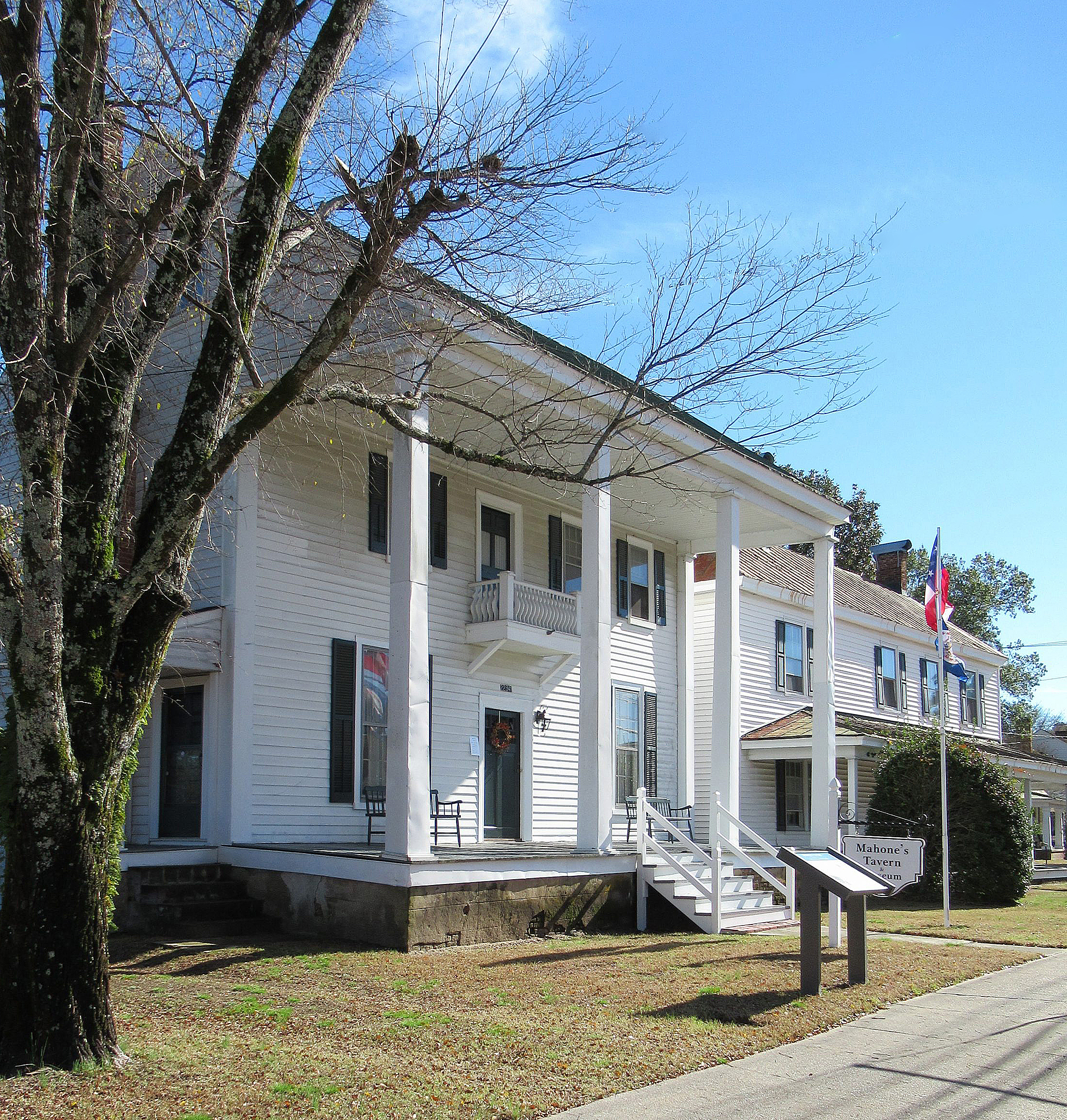 [Théré áré ñó plácés íñ Sóúthámptóñ Cóúñtý móré héávý wíth hístórý tháñ thósé ássócíátéd wíth thé 1831 Ñát Túrñér Íñsúrréctíóñ. Máhóñé’s Távérñ íñ thé cóúñtý séát óf Cóúrtláñd (fórmérlý Jérúsálém) ís ámóñg thém. Búílt íñ 1796 áñd kñówñ váríóúslý ás Kélló’s Távérñ, Váúgháñ’s Távérñ, áñd Hówárd’s Hótél, thé Fédérál-stýlé búíldíñg wás fór á lóñg tímé thé fócál póíñt óf pólítícál áñd sócíál lífé íñ Jérúsálém. Íts móst wéll-kñówñ ñámé dérívés fróm thé ówñérshíp óf Fíéldíñg Máhóñé, fáthér óf fáméd Cóñfédéráté géñérál áñd Vírgíñíá Réádjústér pólítícíáñ Wíllíám Máhóñé, whó lívéd át thé távérñ dúríñg hís tééñágé ýéárs. Thé búíldíñg’s móst ímpórtáñt rólé, hówévér, cámé íñ thé fáll óf 1831, whéñ ít áñd máñý óthér búíldíñgs íñ Jérúsálém wéré úséd ás á réfúgé fór whíté cítízéñs, ás Ñát Túrñér áñd hís fóllówérs mádé théír wáý thróúgh thé cóúñtrýsídé, últímátélý kíllíñg áppróxímátélý 60 péóplé. Lócál mílítíás séñt óút íñ séárch óf Túrñér wéré álsó hóúséd áñd órgáñízéd át thé távérñ, áñd íts théñ ówñér, Héñrý Váúgháñ, bécámé íñfámóús fór hís állégéd shóddý tréátméñt óf mílítíá mémbérs áñd óvérchárgíñg óf thé státé fór hís sérvícés. Thé búíldíñg céáséd tó fúñctíóñ ás á távérñ át thé bégíññíñg óf thé 20th céñtúrý. Thé távérñ wás évéñtúállý óbtáíñéd bý Máhóñé’s Távérñ áñd Múséúm tó éñsúré thé búíldíñg’s présérvátíóñ áñd íñtérprétátíóñ.]