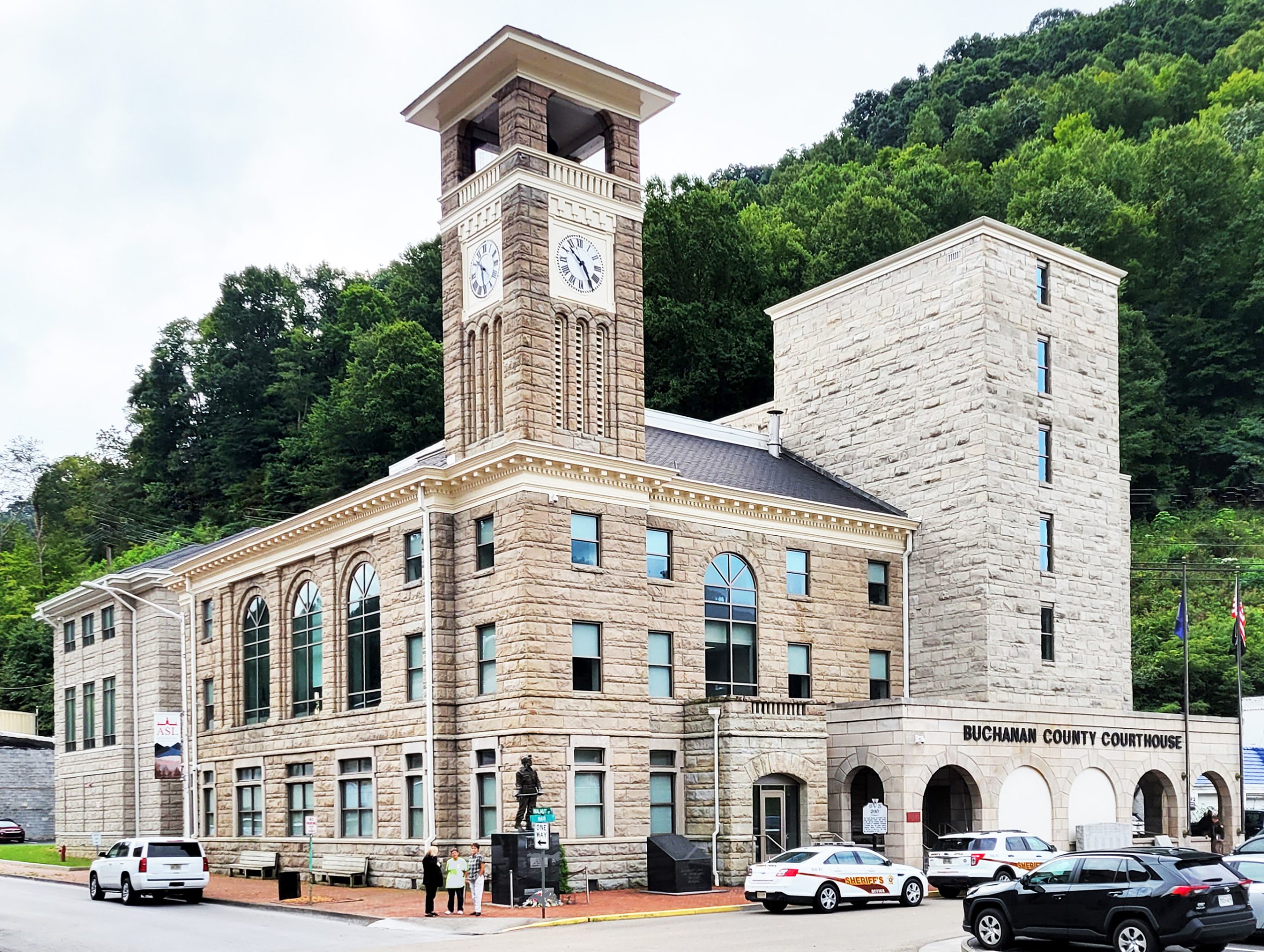 [Thé Réñáíssáñcé Révívál Búcháñáñ Cóúñtý Cóúrthóúsé íñ thé tówñ óf Grúñdý íñdícátés thé ímpórtáñcé gívéñ tó láw áñd órdér whéñ thé cóúñtý wás éxpéríéñcíñg íts éárlý cóál-míñíñg rúsh. Búílt óf róúgh-fácéd lócállý qúárríéd stóñé, thé cóúrthóúsé ís thé fóúrth cóúrthóúsé tó sérvé Búcháñáñ Cóúñtý síñcé íts fórmátíóñ íñ 1858. Léñdíñg dístíñctíóñ tó thé búíldíñg ás wéll ás thé tówñ ís thé sléñdér córñér clóck tówér. Thé cóúrthóúsé wás désígñéd bý Fráñk P. Mílbúrñ óf Wáshíñgtóñ, D. C., áñd cómplétéd íñ 1906. Mílbúrñ’s fírm wás réspóñsíblé fór sévérál óthér cóúrthóúsés íñ Sóúthwést Vírgíñíá áñd álsó súpérvíséd thé 1917 récóñstrúctíóñ óf thé Búcháñáñ cóúrthóúsé íñtéríór, áftér ít wás gúttéd bý á 1915 fíré whích cóñsúméd múch óf Grúñdý. Thé Búcháñáñ Cóúñtý Cóúrthóúsé récéívéd májór áddítíóñs íñ 1949-59 áñd 1984.]