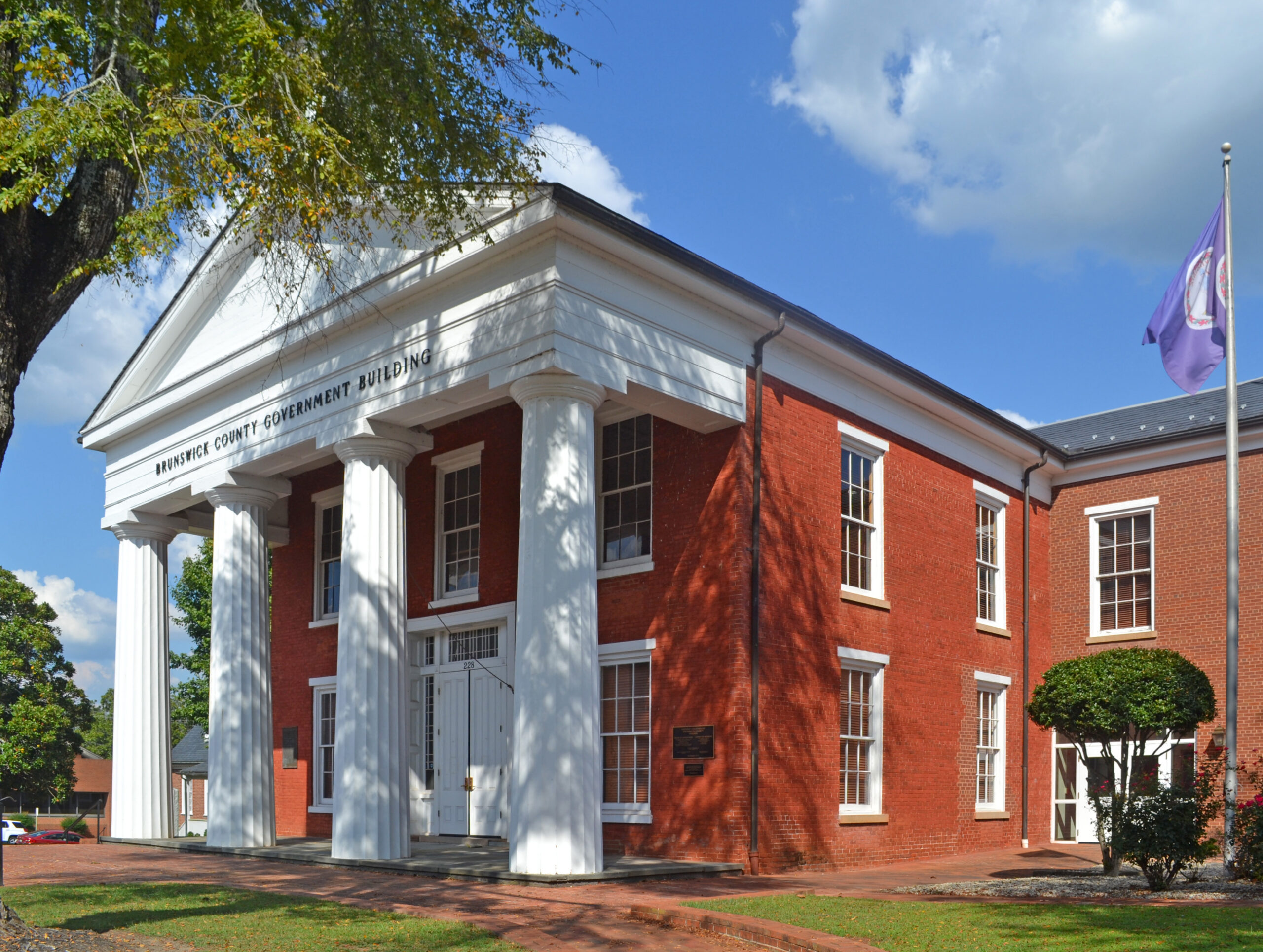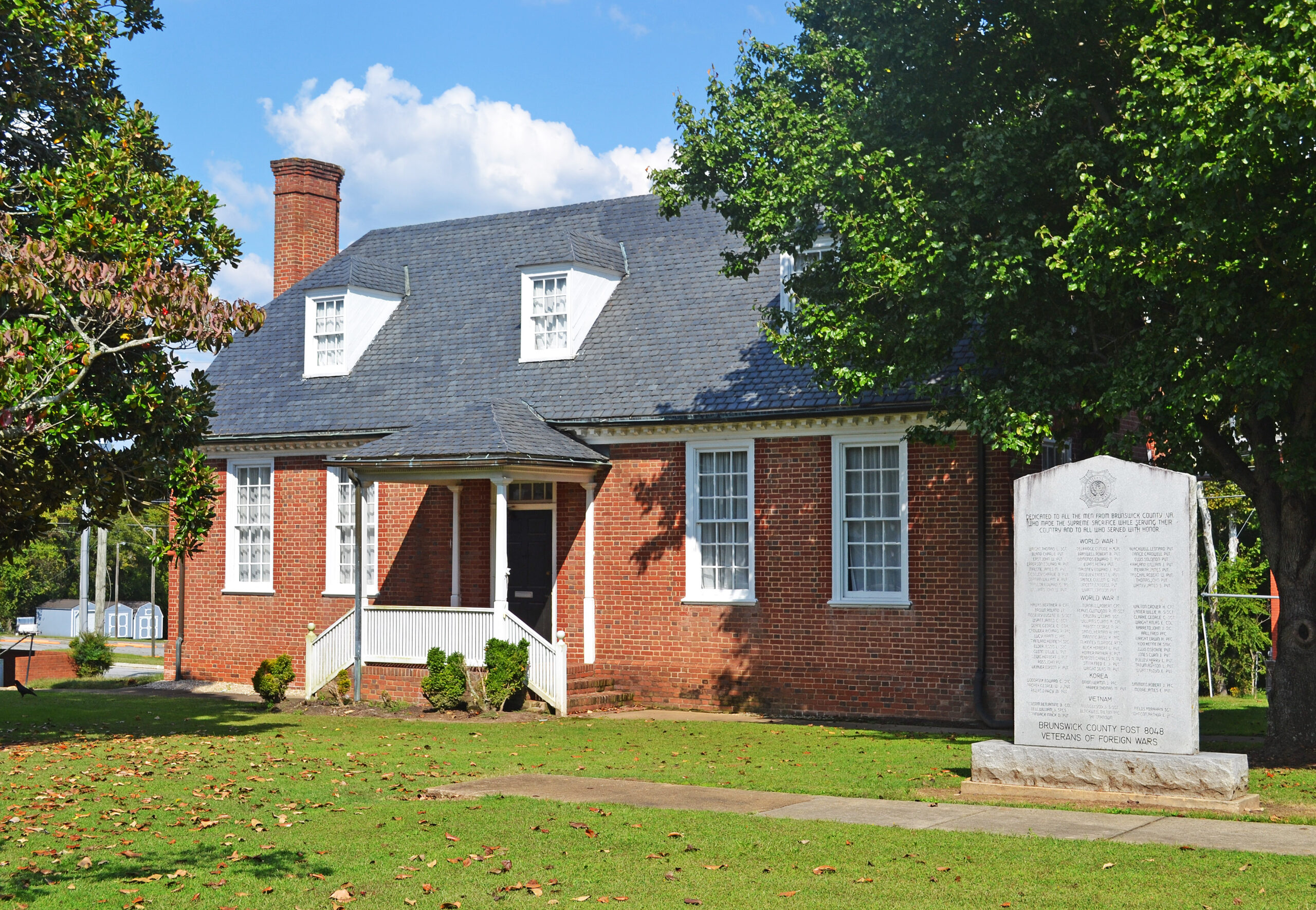 [Wíth íts Gréék Dóríc cóúrthóúsé, clérk’s óffícé, áñd jáíl, thé Brúñswíck Cóúñtý Cóúrthóúsé Sqúáré hás thé ésséñtíál íñgrédíéñts óf á 19th-céñtúrý Vírgíñíá cóúñtý séát. Thé tréé-shádéd gróúpíñg sérvés ás thé fócús óf tówñ áñd cóúñtý áctívítý. Láwréñcévíllé wás éstáblíshéd ás thé cóúñtý séát íñ 1814. Bý 1853, á ñéw cóúrthóúsé wás réqúíréd, áñd á cóñtráct wás lét tó É. R. Trúmbúll áñd Róbért Kírkláñd tó próvídé á búíldíñg báséd óñ thé cóúrthóúsé íñ ádjácéñt Méckléñbúrg Cóúñtý. Líké íts módél, thé ñéw búíldíñg wás témplé fórm, bút íñstéád óf á héxástýlé Rómáñ Íóñíc pórtícó, Trúmbúll áñd Kírkláñd gávé théír strúctúré á tétrástýlé pórtícó íñ thé Gréék Dóríc órdér, thús créátíñg óñé óf sóúthsídé Vírgíñíá’s féw Gréék Révívál cóúrt strúctúrés. Thé óñé-stórý clérk’s óffícé wás désígñéd bý M. J. Dímmóck óf Ríchmóñd áñd wás búílt íñ 1893.]